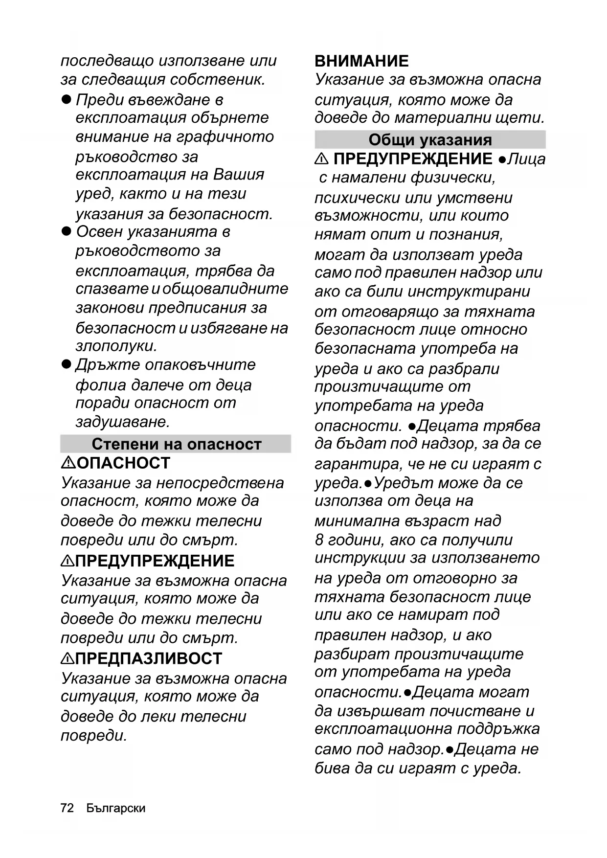 Указание за възможна опасна ситуация, която може да доведе до материални щети. Общи указания 몇 ПРЕДУПРЕЖДЕНИЕ ●Лица с намалени физически, психически или умствени възможности, или които нямат опит и познания, могат да използват уреда само под правилен надзор или ако са били инструктирани от отговарящо за тяхната безопасност лице относно безопасната употреба