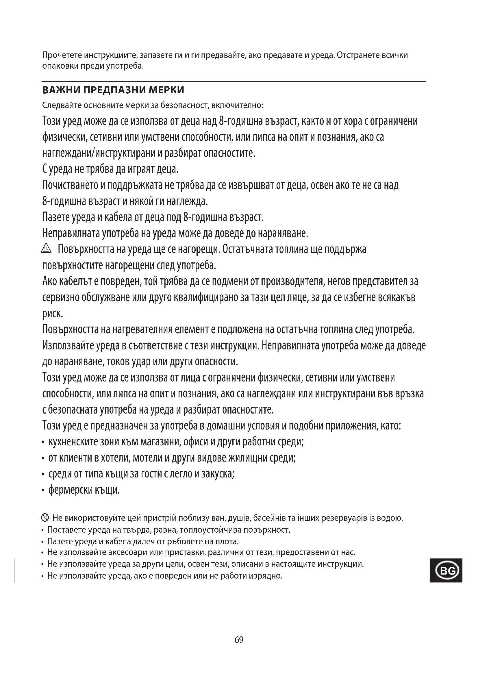 Повърхността на нагревателния елемент е подложена на остатъчна топлина след употреба. Използвайте уреда в съответствие с тези инструкции. Неправилната употреба може да доведе до нараняване, токов удар или други опасности. Този уред може да се използва от лица с ограничени физически, сетивни или умствени способности, или липса на опит и познания, ако са наглеждани или инструктирани във връзка с безопасната употреба на уреда и разбират опасностите. Този уред е предназначен за употреба в домашни условия и подобни приложения, като:
