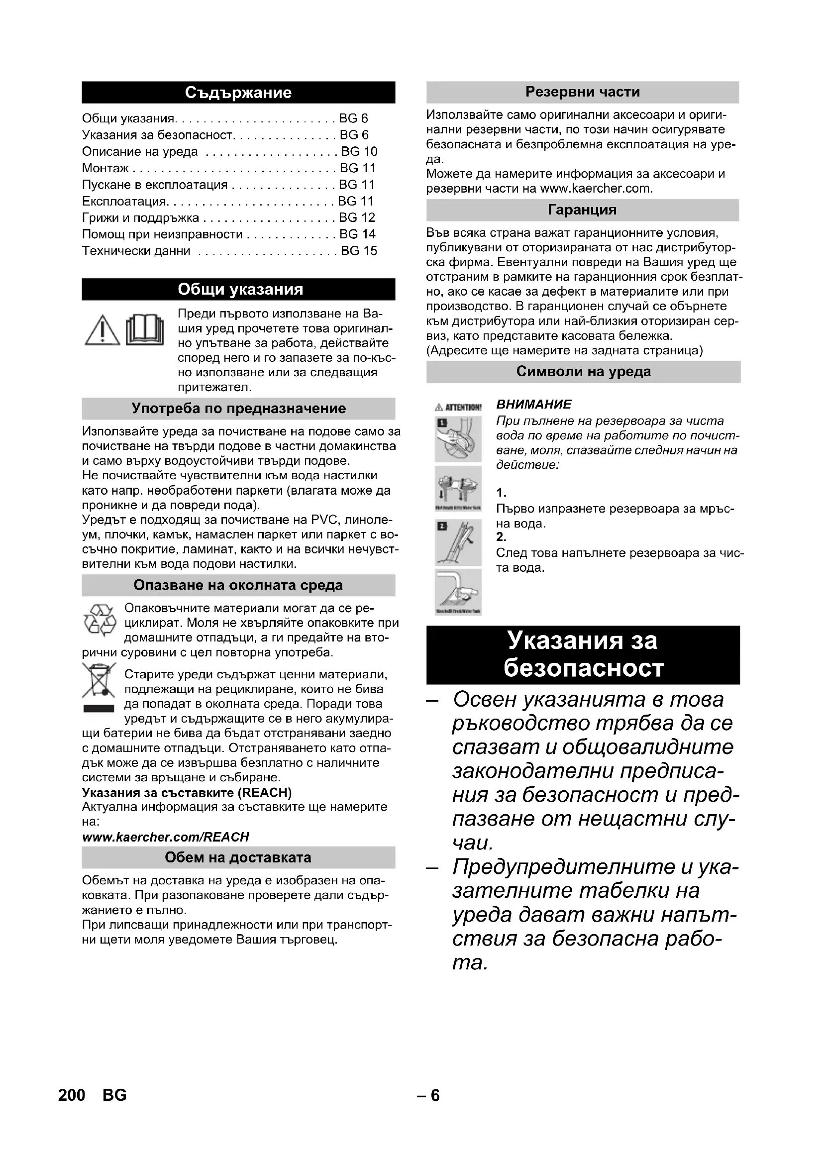 www.kaercher.com/REACH Обемът на доставка на уреда е изобразен на опа- ковката. При разопаковане проверете дали съдър- жанието е пълно. При липсващи принадлежности или при транспорт- ни щети моля уведомете Вашия търговец. Използвайте само оригинални аксесоари и ориги- нални резервни части, по този начин осигурявате безопасната и безпроблемна експлоатация на уре-