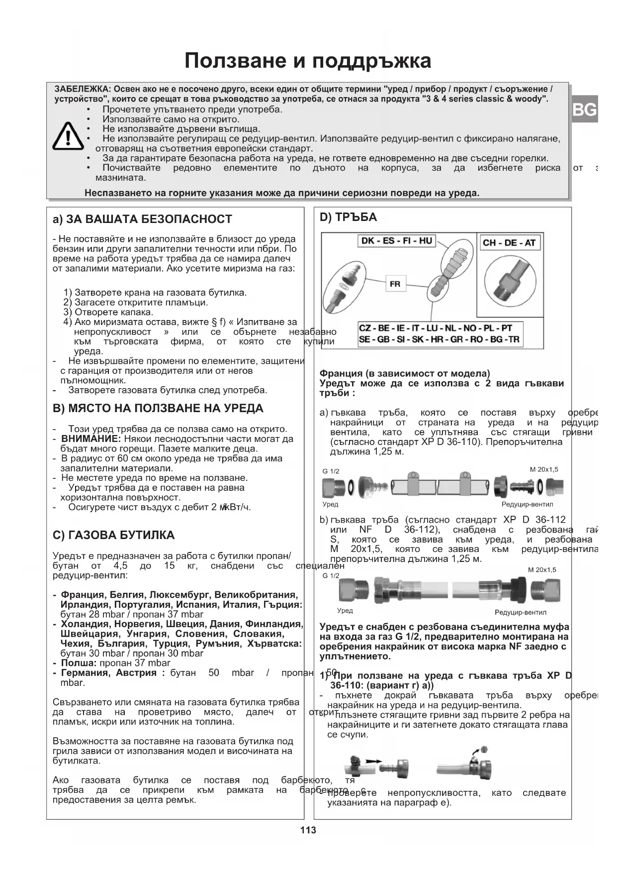 Уредътеснабденсоребреннакрайник.Тойтрябвада сеползва със специална гъвкава тръба, подходяща загазпропанигазбутан.Дължинатанатръбатане трябва да надвишава 1,20 м. Той трябва да бъде подменен, ако е повреден, напукан или съгласно действащитенормативниизисквания.Недърпайтеи неусуквайтетръбата.Пазетеядалеч отнагряващи сечасти.Уверетесе,чегъвкавататръбасеразгъва нормално,безусукванеилиопъване.