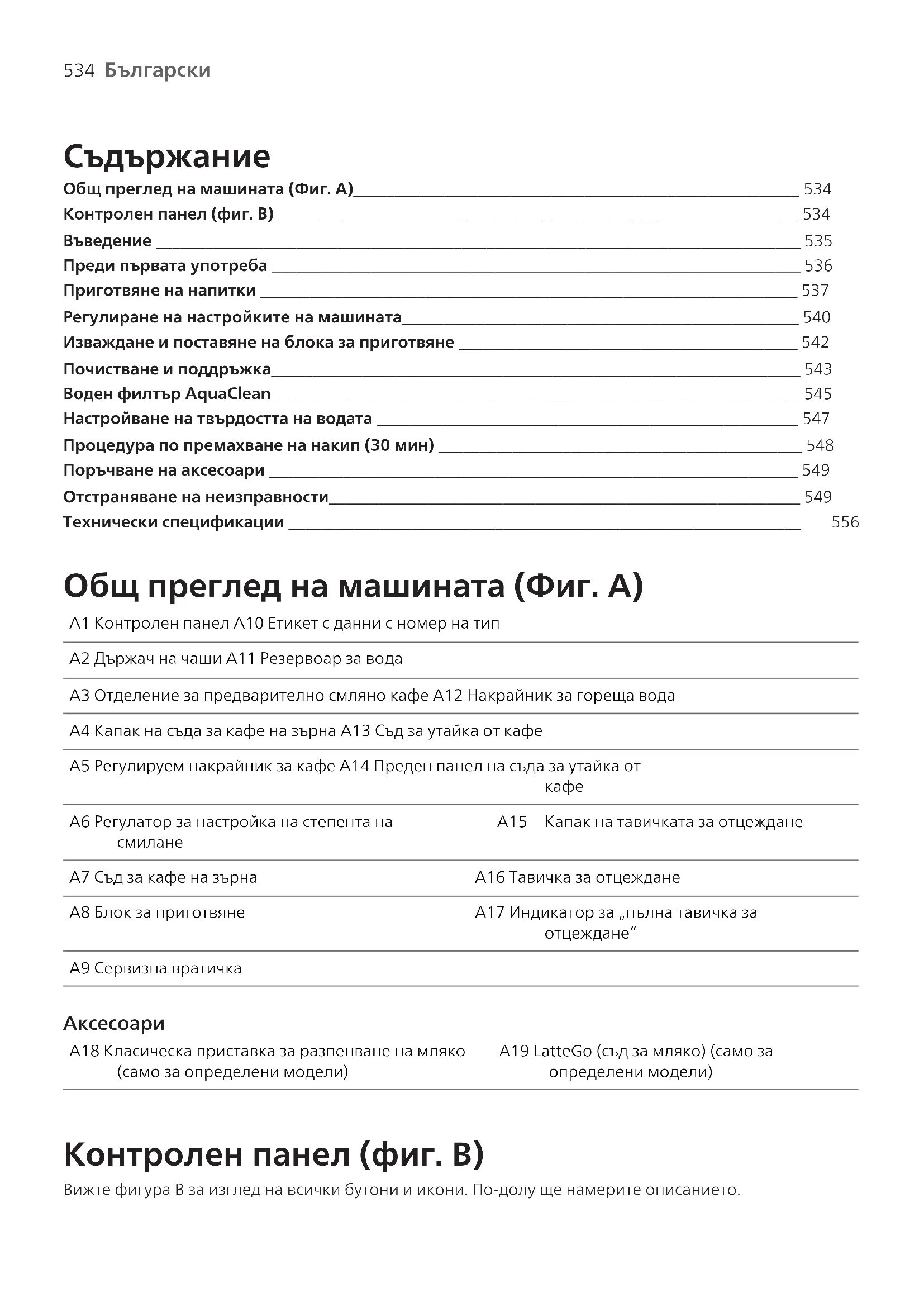 Общ преглед на машината (Фиг. А)______________________________________________________ 534Контролен панел (фиг. B) _______________________________________________________________ 534Въведение ______________________________________________________________________________ 535Преди първата употреба ________________________________________________________________ 536Приготвяне на напитки _________________________________________________________________ 537Регулиране на настройките на машината________________________________________________ 540Изваждане и поставяне на блока за приготвяне _________________________________________ 542Почистване и поддръжка________________________________________________________________ 543Воден филтър AquaClean _______________________________________________________________ 545Настройване на твърдостта на водата ___________________________________________________ 547Процедура по премахване на накип (30 мин) ____________________________________________ 548Поръчване на аксесоари ________________________________________________________________ 549Отстраняване на неизправности_________________________________________________________ 549 Технически спецификации ______________________________________________________________ 556 Общ преглед на машината (Фиг. А) A1 Контролен панел A10 Етикет с данни с номер на типA2 Държач на чаши A11 Резервоар за водаA3 Отделение за предварително смляно кафе A12 Накрайник за гореща водаA4 Капак на съда за кафе на зърна A13 Съд за утайка от кафеA5 Регулируем накрайник за кафе A14 Преден панел на съда за утайка от A6 Регулатор за настройка на степента насмиланеA15 Капак на тавичката за отцежданеA7 Съд за кафе на зърна A16 Тавичка за отцежданеA8 Блок за приготвяне A17 Индикатор за „пълна тавичка заотцеждане“A9 Сервизна вратичка A18 Класическа приставка за разпенване на мляко(само за определени модели)A19 LatteGo (съд за мляко) (само заопределени модели) Контролен панел (фиг. B) Вижте фигура В за изглед на всички бутони и икони. По-долу ще намерите описанието.535