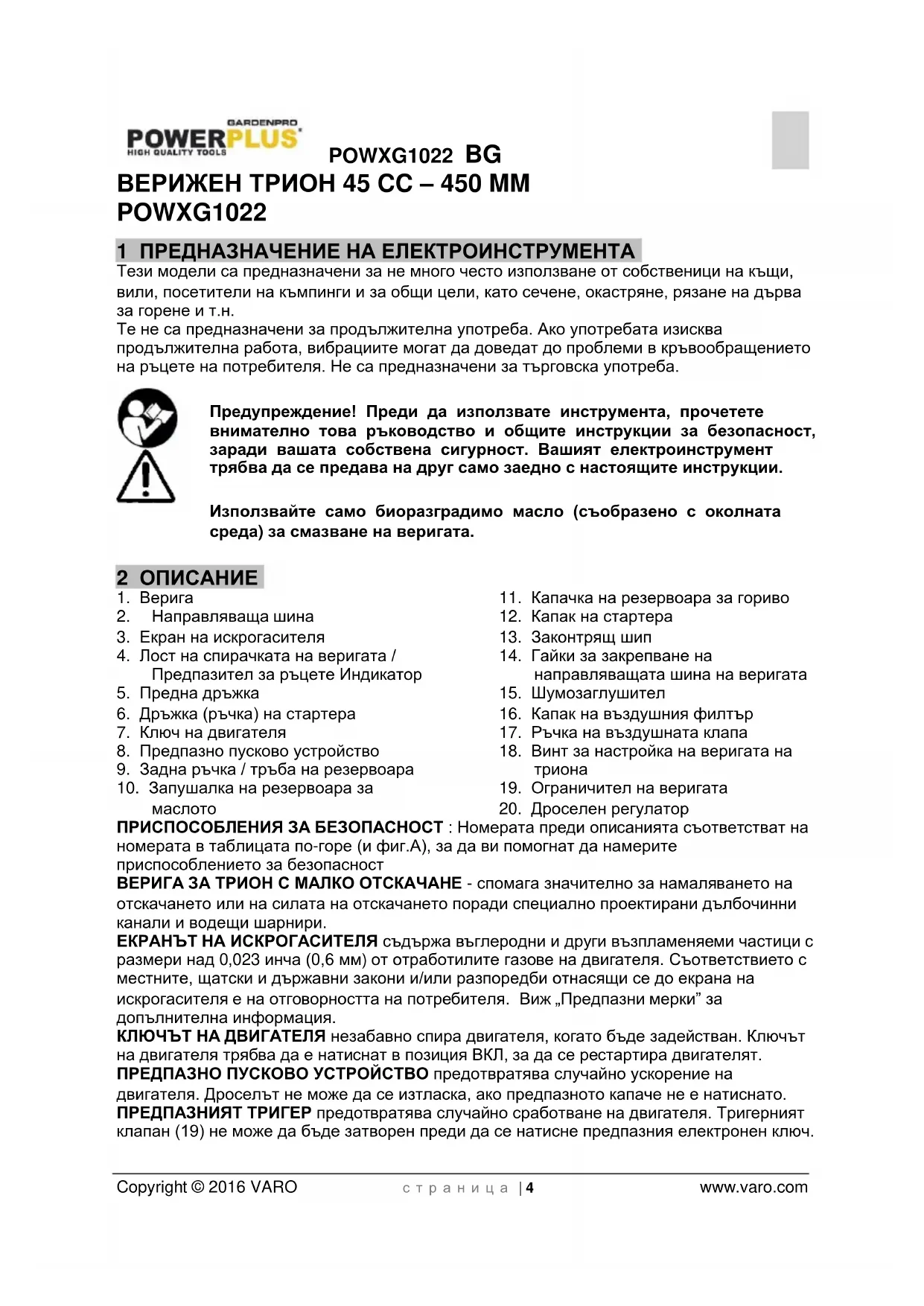 - 19 ДЕКЛАРАЦИЯ ЗА СЪОТВЕТСТВИЕ POWXG1022 BG Copyright © 2016 VARO с т р а н и ц а | 4 www.varo.com ВЕРИЖЕН ТРИОН 45 CC – 450 MM POWXG1022 1 ПРЕДНАЗНАЧЕНИЕ НА ЕЛЕКТРОИНСТРУМЕНТА Тези модели са предназначени за не много често използване от собственици на къщи, вили, посетители на къмпинги и за общи цели, като сечене, окастряне, рязане на дърва за горене и т.н. Те не са предназначени за продължителна употреба. Ако употребата изисква продължителна работа, вибрациите могат да доведат до проблеми в кръвообращението на ръцете на потребителя. Не са предназначени за търговска употреба. Предупреждение! Преди да използвате инструмента, прочетете внимателно това ръководство и общите инструкции за безопасност, заради вашата собствена сигурност. Вашият електроинструмент трябва да се предава на друг само заедно с настоящите инструкции. Използвайте само биоразградимо масло (съобразено с околната среда) за смазване на веригата. 2 ОПИСАНИЕ p. 28