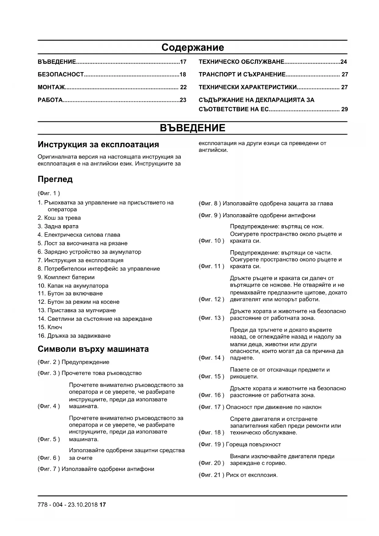 Инструкции за безопасност при техническо обслужване ПРЕДУПРЕЖДЕНИЕ: Изпълнявайте стъпките от техническото обслужване, посочени в тази инструкция за експлоатация. По-значителни ремонтни дейности трябва да се изпълняват от одобрен сервиз. Извършете правилно техническото обслужване, за да увеличите срока на експлоатация на продукта и да намалите опасността от инциденти. Одобрен сервиз може да извършва професионални ремонтни дейности. За повече информация говорете с най- близкия до Вас сервиз. ПРЕДУПРЕЖДЕНИЕ: За да предотвратите неволно стартиране по време на транспортиране, техническо обслужване или поправка, извадете 20 778 - 004 - 23.10.2018комплекта батерии и изчакайте най-малко 5 секунди преди да го смените. ПРЕДУПРЕЖДЕНИЕ: Носете ръкавици за тежки условия, когато използвате режещото оборудване. Ножът е много остър и можете лесно да се порежете.