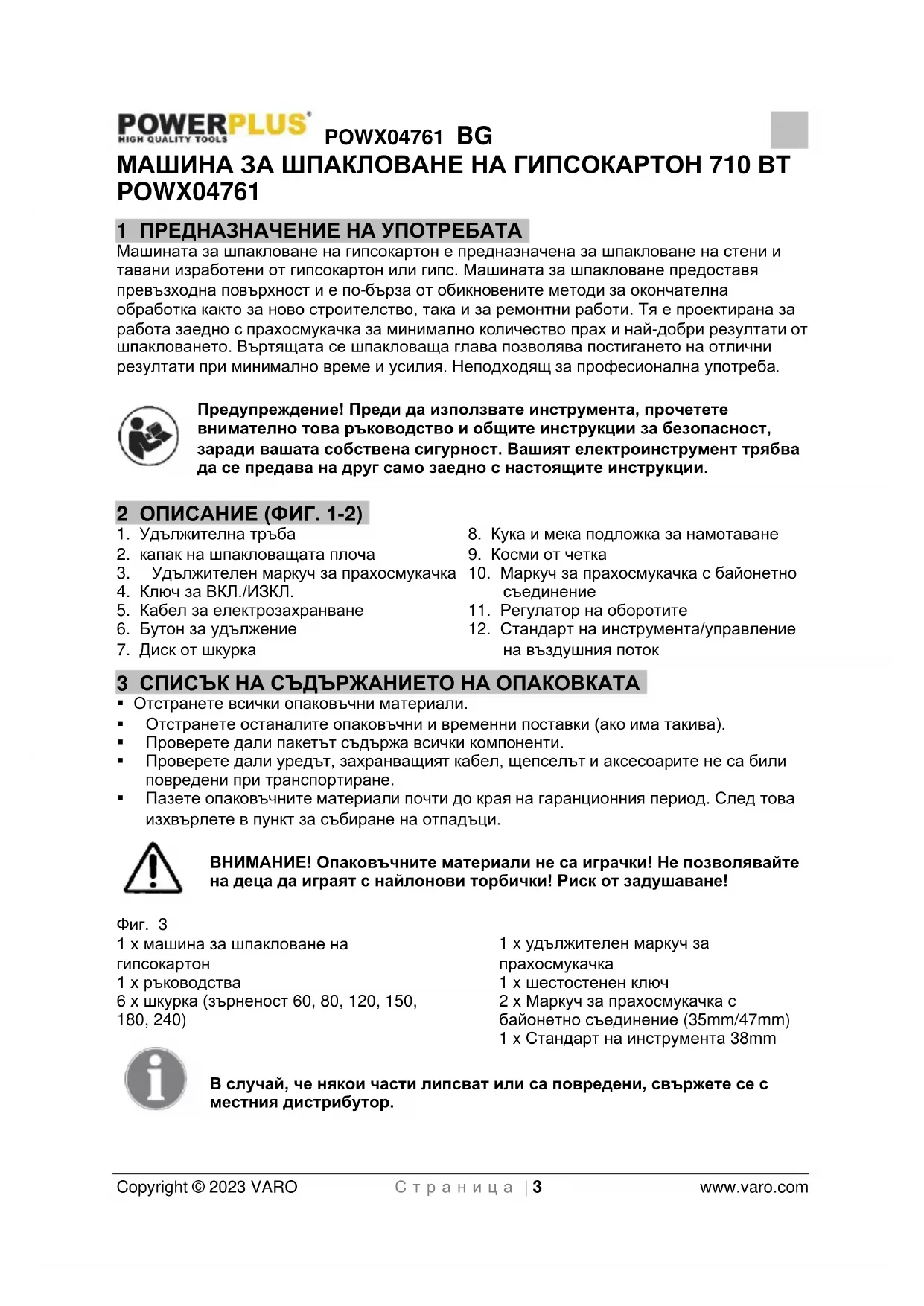 - 15 ДЕКЛАРАЦИЯ ЗА СЪОТВЕТСТВИЕ POWX04761 BG Copyright © 2023 VARO С т р а н и ц а | 3 www.varo.com МАШИНА ЗА ШПАКЛОВАНЕ НА ГИПСОКАРТОН 710 ВТ POWX04761 1 ПРЕДНАЗНАЧЕНИЕ НА УПОТРЕБАТА Машината за шпакловане на гипсокартон е предназначена за шпакловане на стени и тавани изработени от гипсокартон или гипс. Машината за шпакловане предоставя превъзходна повърхност и е по-бърза от обикновените методи за окончателна обработка както за ново строителство, така и за ремонтни работи. Тя е проектирана за работа заедно с прахосмукачка за минимално количество прах и най-добри резултати от шпакловането. Въртящата се шпакловаща глава позволява постигането на отлични резултати при минимално време и усилия. Неподходящ за професионална употреба. Предупреждение! Преди да използвате инструмента, прочетете внимателно това ръководство и общите инструкции за безопасност, заради вашата собствена сигурност. Вашият електроинструмент трябва да се предава на друг само заедно с настоящите инструкции. 2 ОПИСАНИЕ (ФИГ. 1-2) p. 11