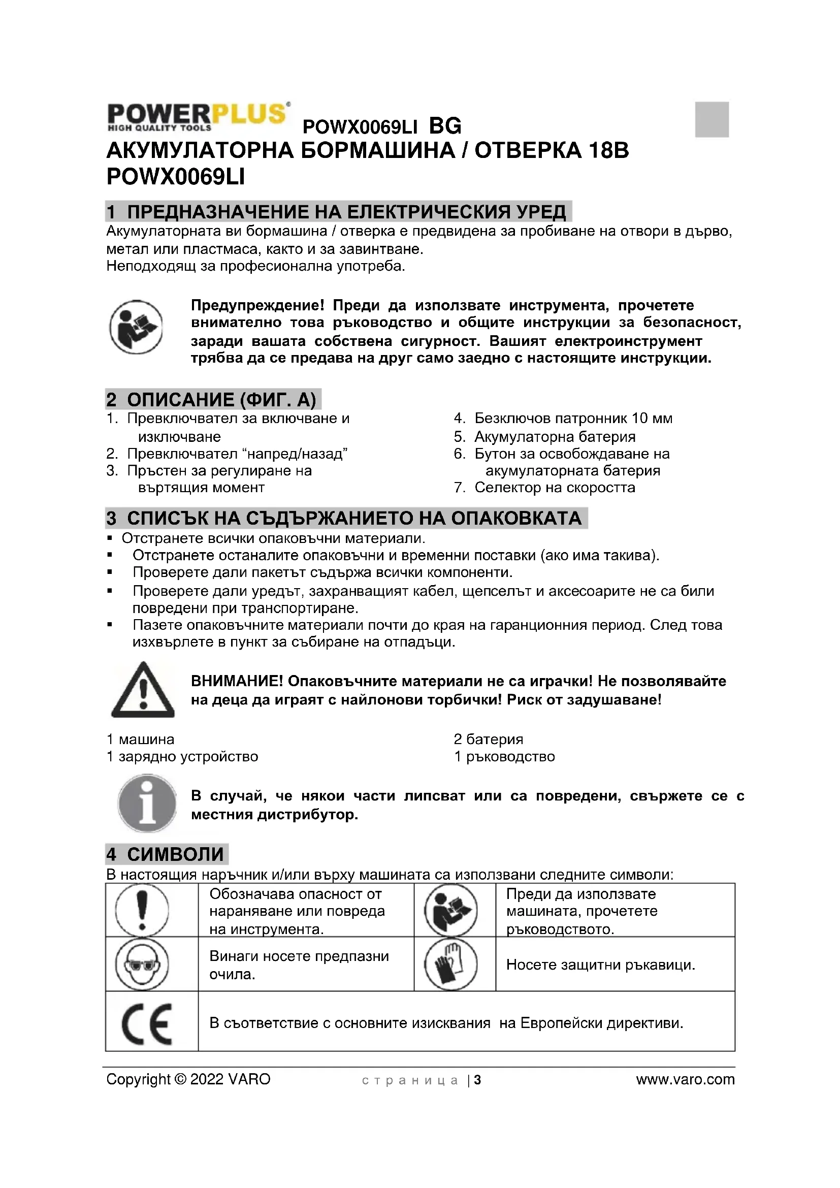 В съответствие с основните изисквания на Европейски директиви.POWX0069LI BG Copyright © 2022 VARO с т р а н и ц а | 4 www.varo.com 5 ОБЩИ ПРЕДУПРЕЖДЕНИЯ ЗА БЕЗОПАСНОСТ ПРИ ИЗПОЛЗВАНЕ НА ЕЛЕКТРОИНСТРУМЕНТИ Прочетете всички предупреждения за безопасност и инструкции. Неспазването им може да причини електрически удар, пожар и/или сериозно нараняване. Запазете всички предупреждения и инструкции за бъдещи справки. Терминът „електроинструмент” в предупрежденията се отнася за вашия захранван от мрежата (с кабел) или за работещ на батерии (без кабел) електроинструмент.