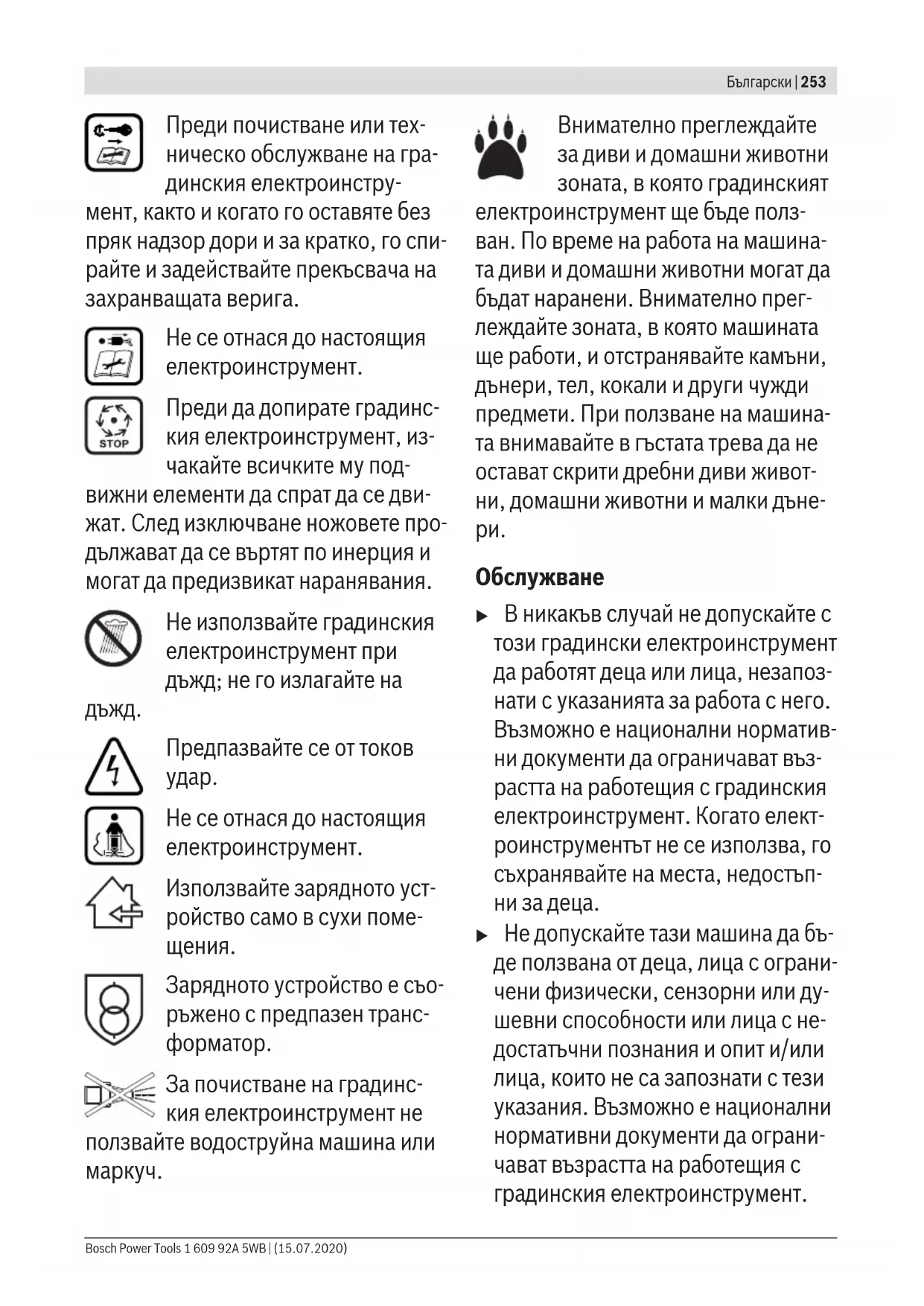 Предупреждение: Когато градинският електроинстру- мент работи, стойте на безо- пасно разстояние от него. Внимание: Не допирайте въртящите се ножове. Но- жовете са остри. Съществу- ва опасност да Ви бъде отрязан пръст на краката или ръцете. 1 609 92A 5WB | (15.07.2020) Bosch Power ToolsБългарски | 253 Преди почистване или тех- ническо обслужване на гра- динския електроинстру- мент, както и когато го оставяте без пряк надзор дори и за кратко, го спи- райте и задействайте прекъсвача на захранващата верига. Не се отнася до настоящия електроинструмент. Преди да допирате градинс- кия електроинструмент, из- чакайте всичките му под- вижни елементи да спрат да се дви- жат. След изключване ножовете про- дължават да се въртят по инерция и могат да предизвикат наранявания. Не използвайте градинския електроинструмент при дъжд; не го излагайте на
