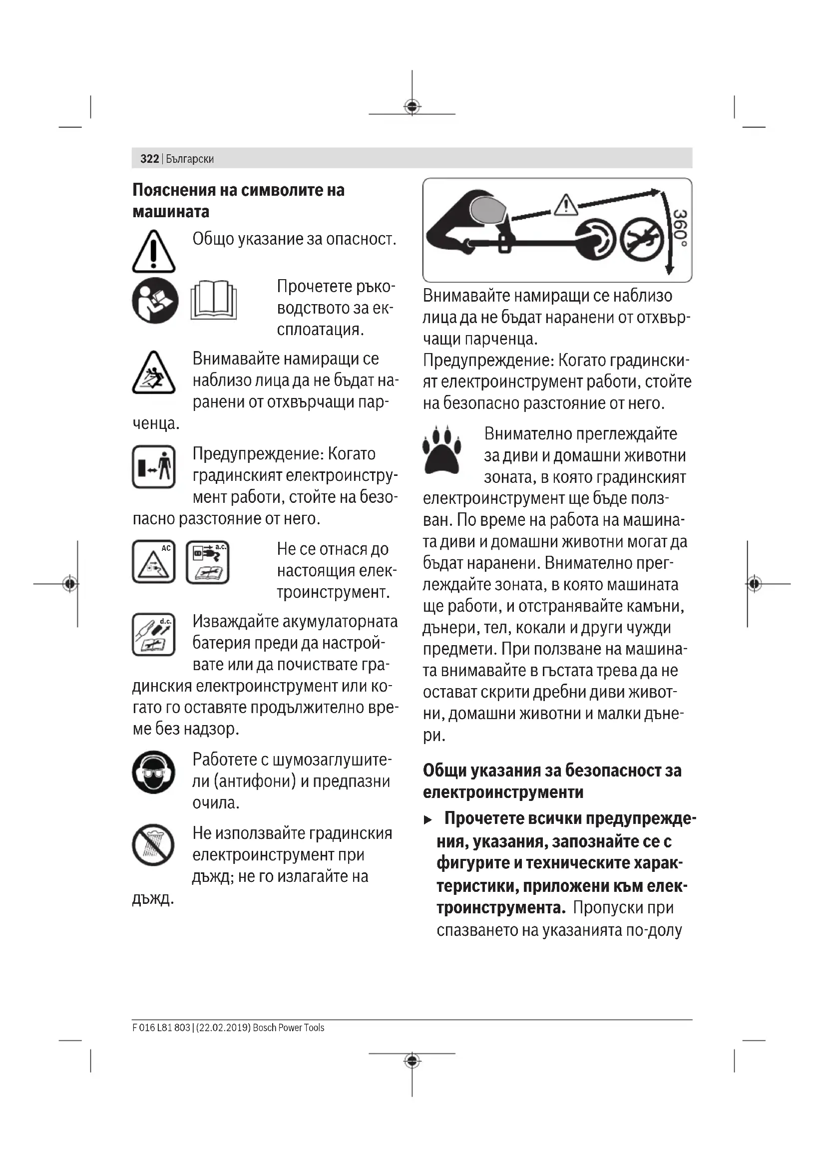Общи указания за безопасност за електроинструменти u Прочетете всички предупрежде- ния, указания, запознайте се с фигурите и техническите харак- теристики, приложени към елек- троинструмента. Пропуски при спазването на указанията по-долу F 016 L81 803 | (22.02.2019) Bosch Power ToolsБългарски | 323 могат да предизвикат токов удар и/ или тежки травми. u Съхранявайте тези указания на сигурно място. u Използваният по-долу термин "електроинструмент" се отнася до захранвани от електрическата мре- жа електроинструменти (със зах- ранващ кабел) и до захранвани от акумулаторна батерия електроинс- трументи (беззахранващ кабел). Безопасност на работното място u Пазете работното си място чисто и добре осветено. Разхвърляните или тъмни работни места са пред- поставка за инциденти. u Не работете с електроинстру- мента в среда с повишена опас- ност от възникване на експло- зия, в близост до леснозапалими течности, газове или прахооб- разни материали. По време на ра- бота в електроинструментите се от- делят искри, които могат да възп- ламенят прахообразни материали