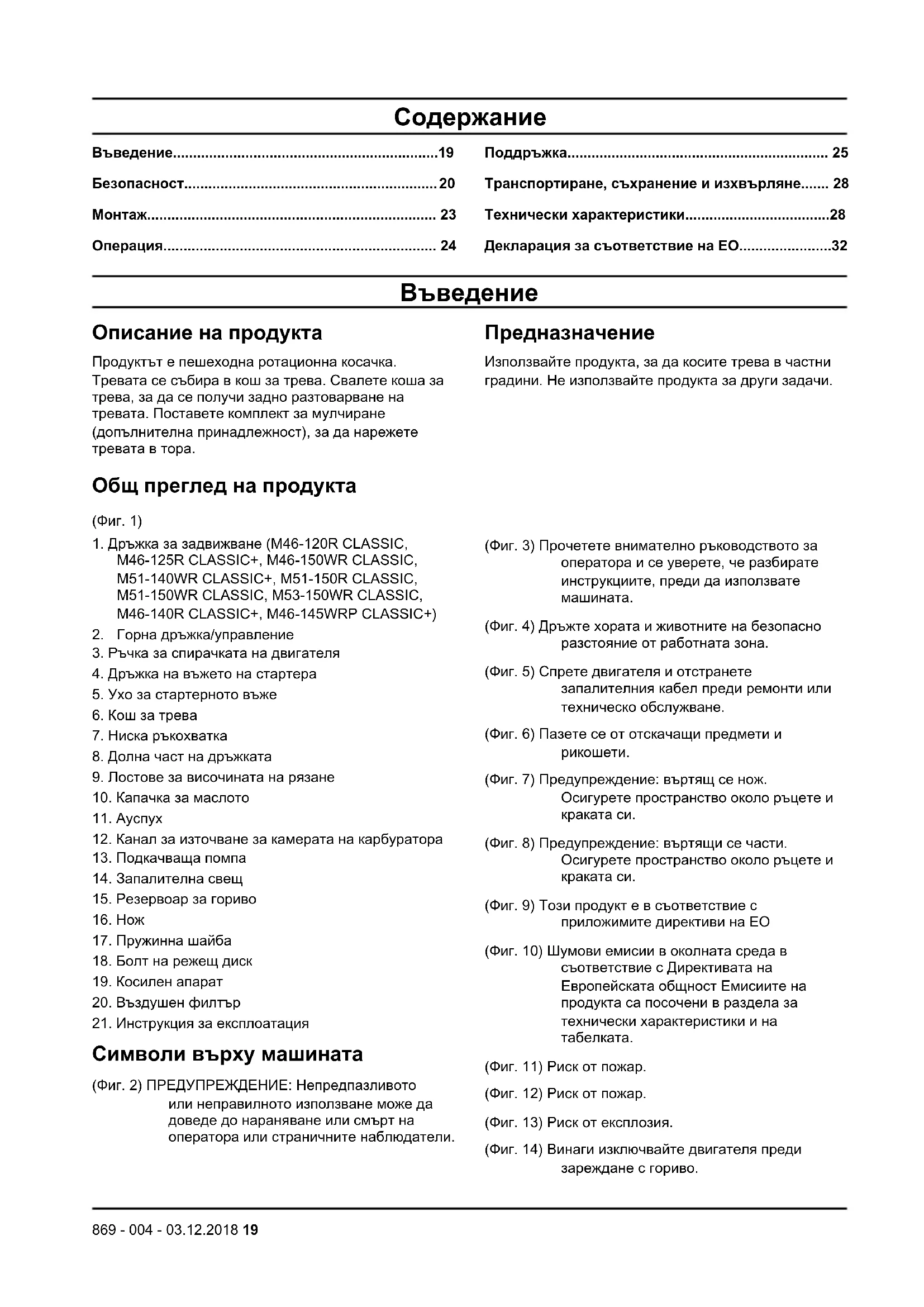 Описание на продукта Продуктът е пешеходна ротационна косачка. Тревата се събира в кош за трева. Свалете коша за трева, за да се получи задно разтоварване на тревата. Поставете комплект за мулчиране (допълнителна принадлежност), за да нарежете тревата в тора. Предназначение Използвайте продукта, за да косите трева в частни градини. Не използвайте продукта за други задачи. Общ преглед на продукта (Фиг. 1)