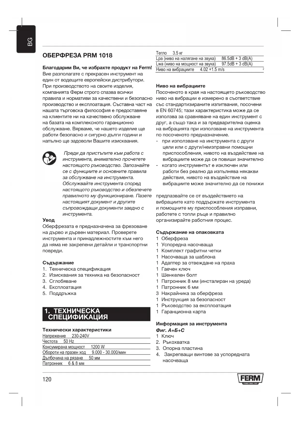 ОБЕРФРЕЗА PRM 1018 Благодарим Ви, че избрахте продукт на Ferm! Вие разполагате с прекрасен инструмент на един от водещите европейски дистрибутори. При производството на своите изделия, компанията Ферм строго спазва всички правила и нормативи за качествени и безопасно производство и експлоатация. Съставна част на нашата търговска философия е предоставяне на клиентите ни на качествено обслужване на базата на комплексното гаранционно обслужване. Вярваме, че нашето изделие ще работи безопасно и сигурно дълги години и напълно ще задоволи Вашите изисквания. Предидапристъпитекъмработас инструмента,внимателнопрочетете настоящоторъководство.Запознайте сесфункциитеиосновнитеправила заобслужваненаинструмента. Обслужвайтеинструментаспоред настоящоторъководствоиобезпечете правилнотомуфункциониране.Пазете настоящиятдокументидругите съпровождащидокументизаеднос инструмента.