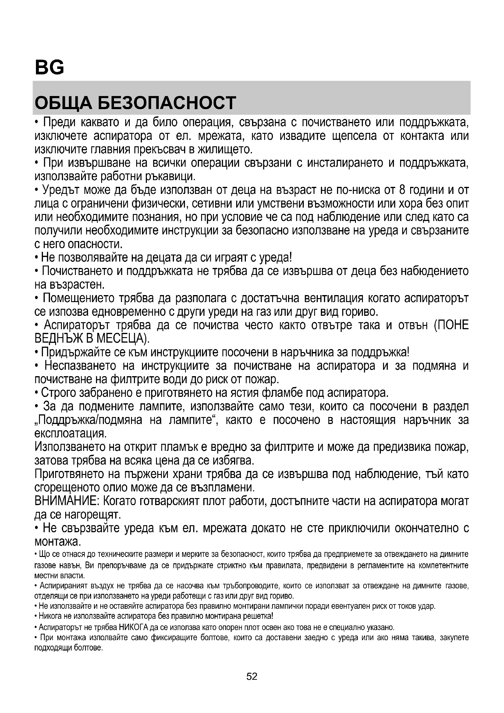 - Помещението трябва да разполага с достатъчна вентилация когато аспираторът се изпозва едновременно с други уреди на газ или друг вид гориво.