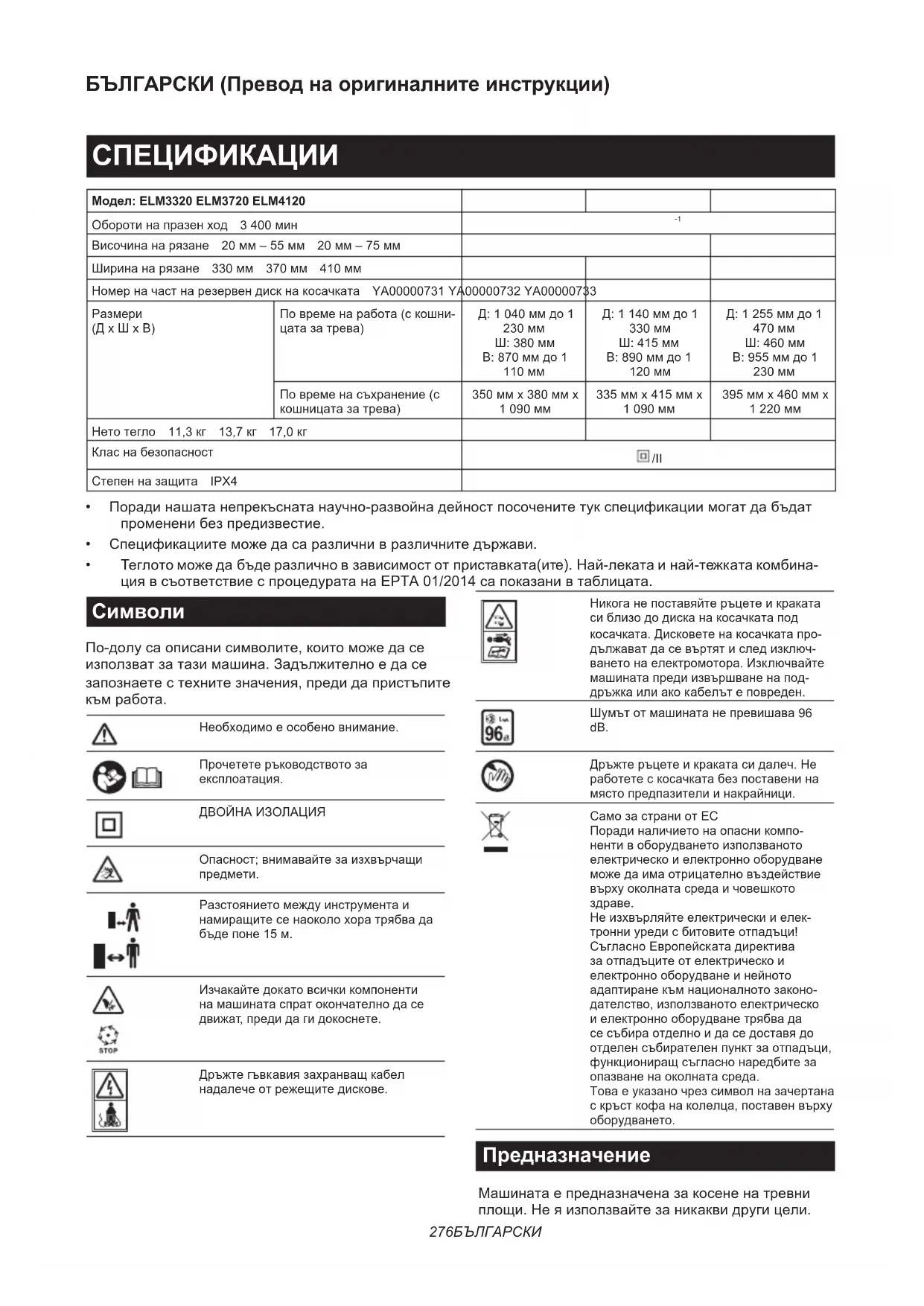 Неизхвърляйтеелектрическииелек- тронниуредисбитовитеотпадъци! СъгласноЕвропейскатадиректива заотпадъцитеотелектрическои електроннооборудванеинейното адаптиранекъмнационалнотозаконо- дателство,използванотоелектрическо иелектроннооборудванетрябвада сесъбираотделноидаседоставядо отделенсъбирателенпунктзаотпадъци, функциониращсъгласнонаредбитеза опазваненаоколнатасреда. Товаеуказаночрезсимволназачертана скръсткофанаколелца,поставенвърху оборудването. Предназначение Машинатаепредназначеназакосененатревни площи.Неяизползвайтезаникаквидругицели.277 БЪЛГАРСКИ Използванетонамашинатазадейности,коитоне сапопредназначение,можедадоведедоопасна