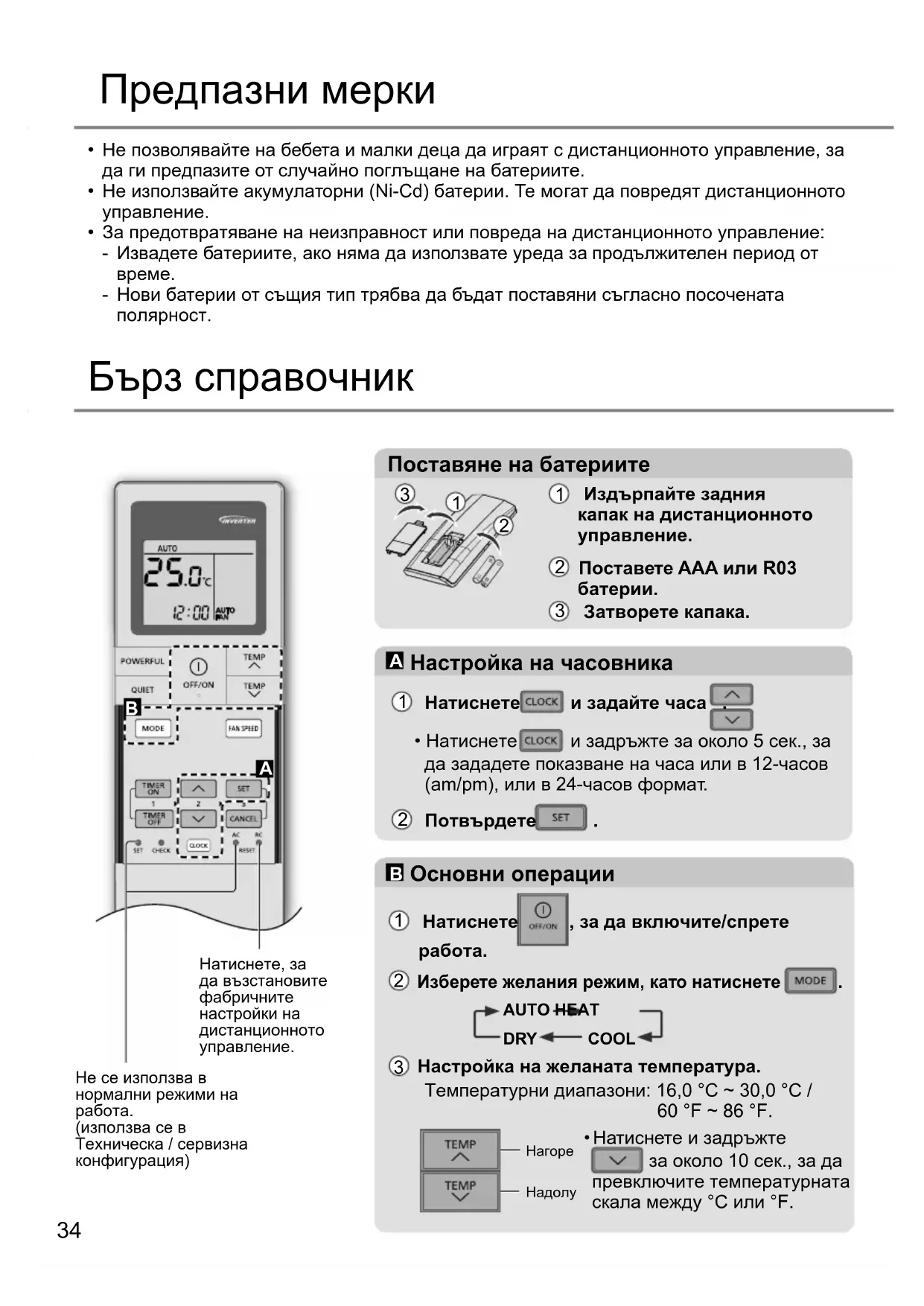 - Това управление не е приложимо, когато е настроен ТАЙМЕР. Режим на работа