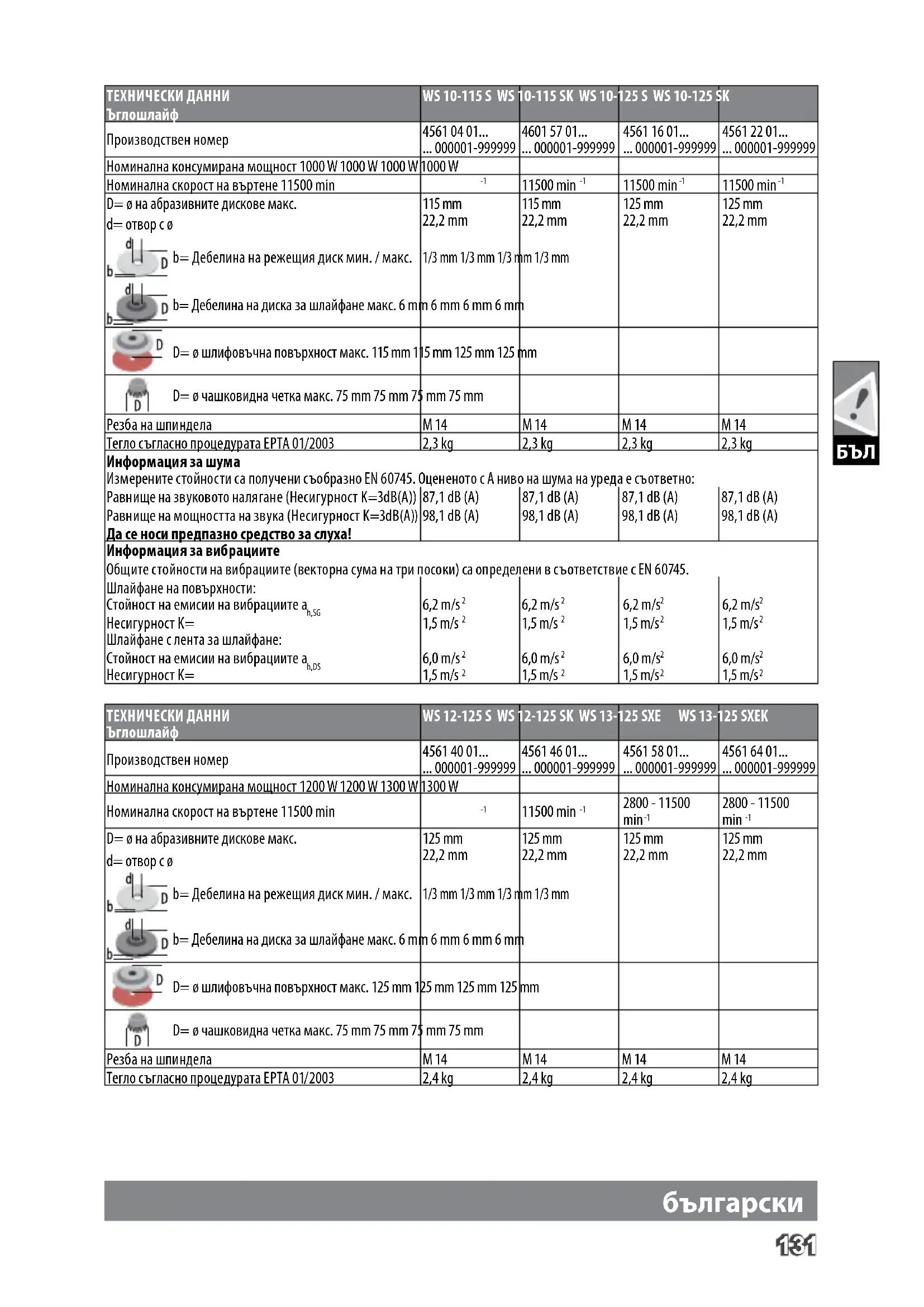 D= ø на абразивните дискове макс. d= отвор с ø 125 mm 22,2 mm 125 mm 22,2 mm 125 mm 22,2 mm 125 mm 22,2 mm b= Дебелина на режещия диск мин. / макс. 1/3 mm 1/3 mm 1/3 mm 1/3 mm b= Дебелина на диска за шлайфане макс. 6 mm 6 mm 6 mm 6 mm D= ø шлифовъчна повърхност макс. 125 mm 125 mm 125 mm 125 mm D= ø чашковидна четка макс. 75 mm 75 mm 75 mm 75 mm Резба на шпиндела M 14 M 14 M 14 M 14 Тегло съгласно процедурата EPTA 01/2003 2,4 kg 2,4 kg 2,4 kg 2,4 kg132