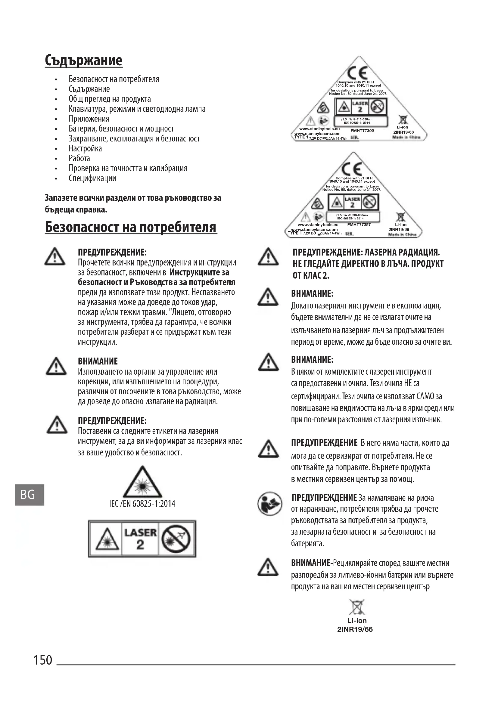 - Лазерният продукт не може да се сервизира от потребителя и трябва да се върне на дистрибутор на Сервизен/гаранционен център на Stanley, в случай на отказ или повреда. Всякакво сервизно обслужване следва да се извършва от квалифицирано лице, което използва само оригинални резервни части. Това ще осигури безопасността на продукта.153