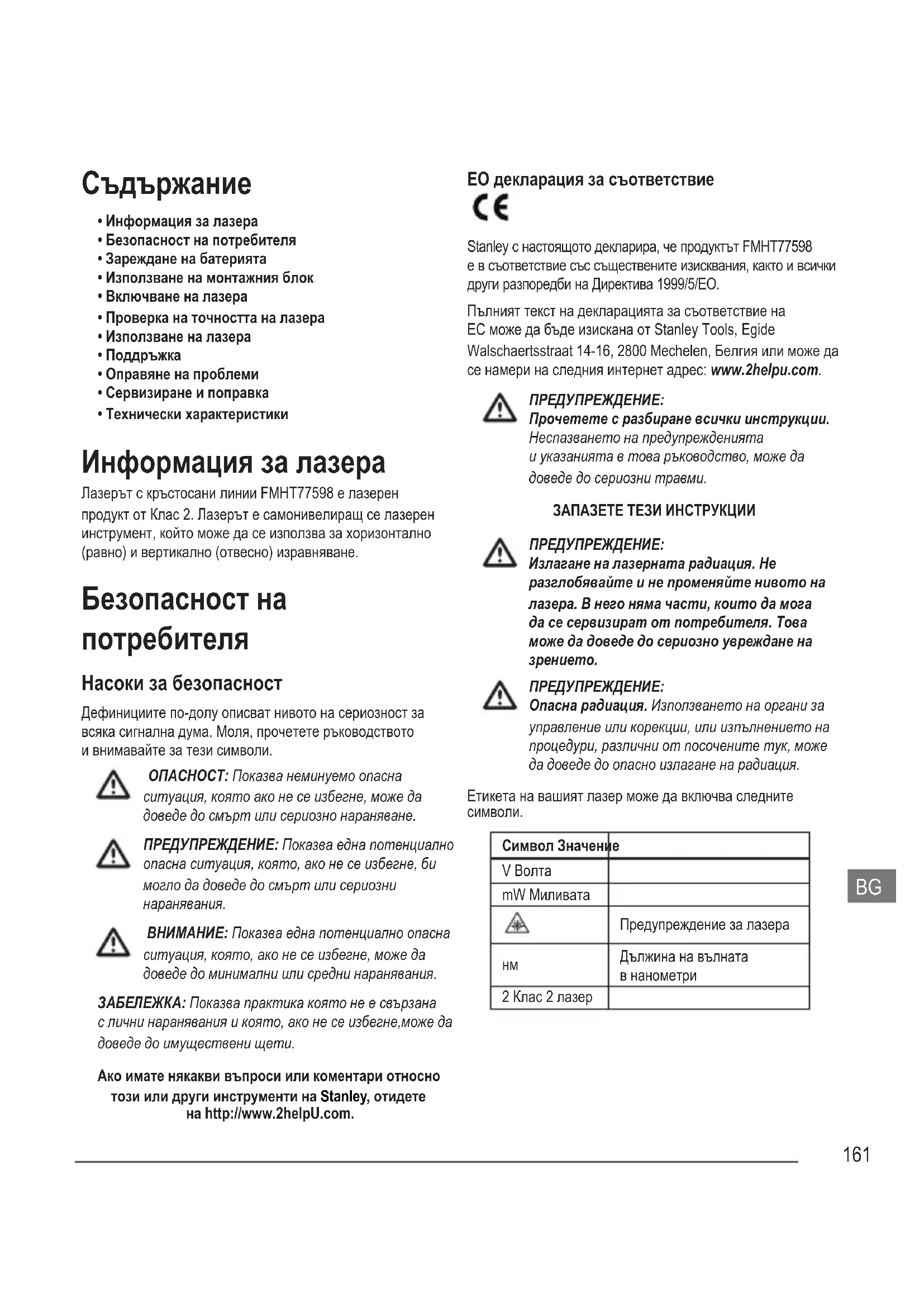 - Технически характеристики Информация за лазера Лазерът с кръстосани линии FMHT77598 е лазерен продукт от Клас 2. Лазерът е самонивелиращ се лазерен инструмент, който може да се използва за хоризонтално (равно) и вертикално (отвесно) изравняване. Безопасност на потребителя Насоки за безопасност Дефинициите по-долу описват нивото на сериозност за всяка сигнална дума. Моля, прочетете ръководството и внимавайте за тези символи. ОПАСНОСТ: Показва неминуемо опасна ситуация, която ако не се избегне, може да доведе до смърт или сериозно нараняване. ПРЕДУПРЕЖДЕНИЕ: Показва една потенциално опасна ситуация, която, ако не се избегне, би могло да доведе до смърт или сериозни наранявания. ВНИМАНИЕ: Показва една потенциално опасна ситуация, която, ако не се избегне, може да доведе до минимални или средни наранявания. ЗАБЕЛЕЖКА: Показва практика която не е свързана с лични наранявания и която, ако не се избегне,може да доведе до имуществени щети. Ако имате някакви въпроси или коментари относно този или други инструменти на Stanley, отидете на http://www.2helpU.com. ЕО декларация за съответствие Stanley с настоящото декларира, че продуктът FMHT77598 е в съответствие със съществените изисквания, както и всички други разпоредби на Директива 1999/5/ЕО. Пълният текст на декларацията за съответствие на ЕС може да бъде изискана от Stanley Tools, Egide Walschaertsstraat 14-16, 2800 Mechelen, Белгия или може да се намери на следния интернет адрес: www.2helpu.com. ПРЕДУПРЕЖДЕНИЕ: Прочетете с разбиране всички инструкции. Неспазването на предупрежденията и указанията в това ръководство, може да доведе до сериозни травми. ЗАПАЗЕТЕ ТЕЗИ ИНСТРУКЦИИ ПРЕДУПРЕЖДЕНИЕ: Излагане на лазерната радиация. Не разглобявайте и не променяйте нивото на лазера. В него няма части, които да мога да се сервизират от потребителя. Това може да доведе до сериозно увреждане на