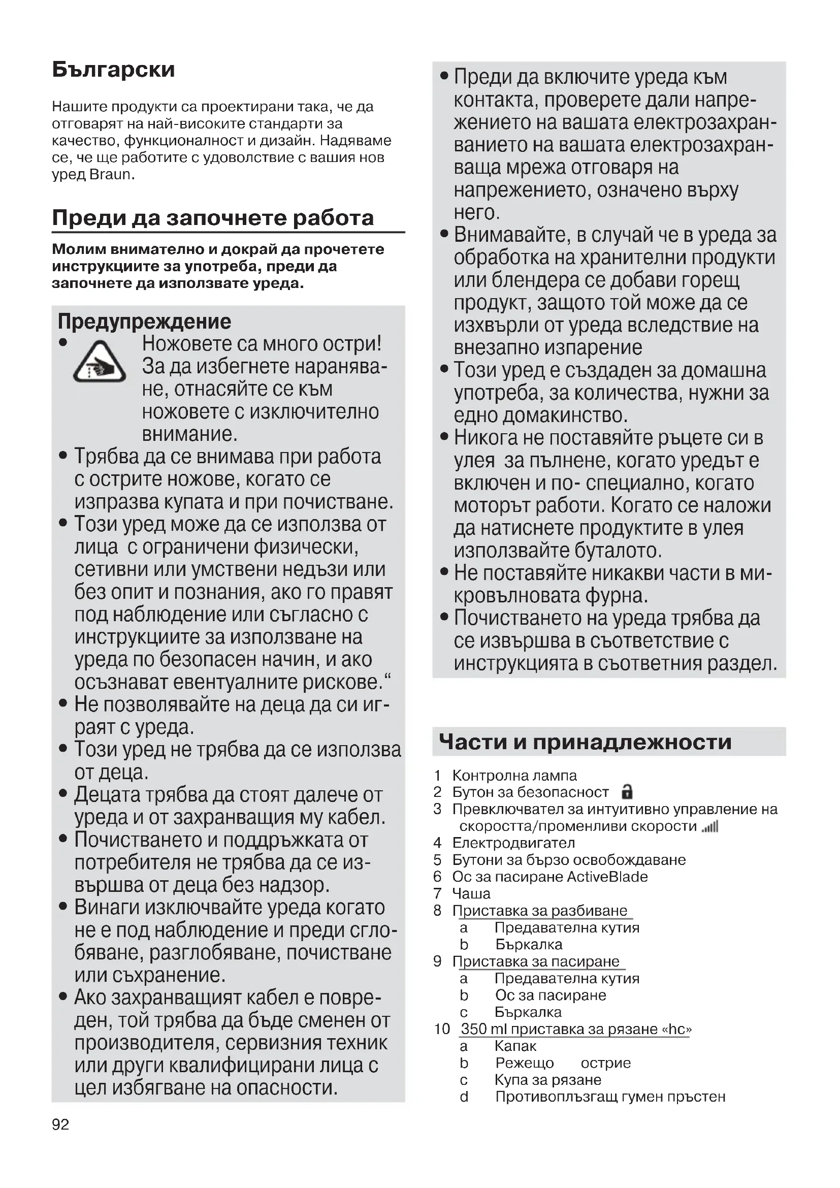 Нашите продукти са проектирани така, че да отговарят на най-високите стандарти за качество, функционалност и дизайн. Надяваме се, че ще работите с удоволствие с вашия нов уред Braun. Преди да започнете работа Молим внимателно и докрай да прочетете инструкциите за употреба, преди да започнете да използвате уреда. Предупреждение