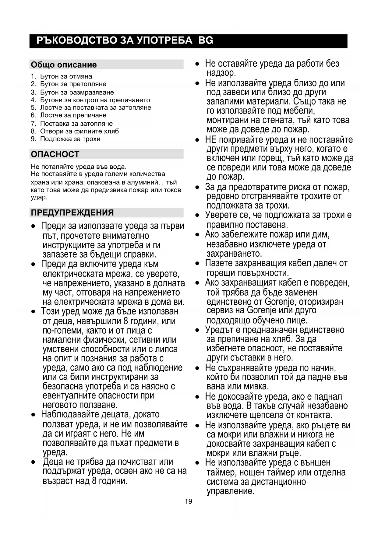 - Уредът е предназначен единствено за препичане на хляб. За да избегнете опасност, не поставяйте други съставки в него.