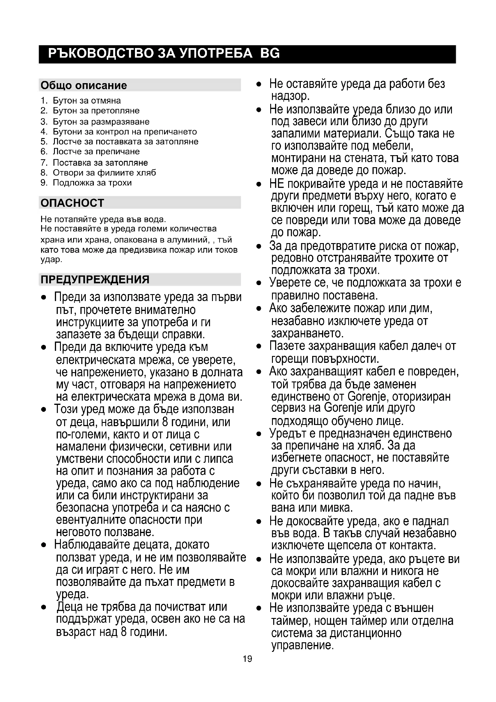 издърпайте подложката за трохи и я изпразнете. Не се опитвайте да отстраните трохите от уреда, като го обърнете надолу и го разтърсите. ОКОЛНА СРЕДА След изтичане на експлоатационния цикъл на уреда, не го изхвърляйте заедно с общия домакински отпадък. Предайте уреда в оторизиран център за рециклиране. По този начин ще помогнете за опазване на околната среда. ГАРАНЦИЯ И СЕРВИЗ За повече информация или в случай на проблеми, моля, свържете се с Кол-центъра на Gorenje във вашата държава (телефонните номера са изброени в листа с международната гаранция). Ако във вашата държава няма такъв център, моля, свържете се с местното представителство на Gorenje или с отдела на Gorenje за малки домакински уреди. Запазваме си правото на промени.