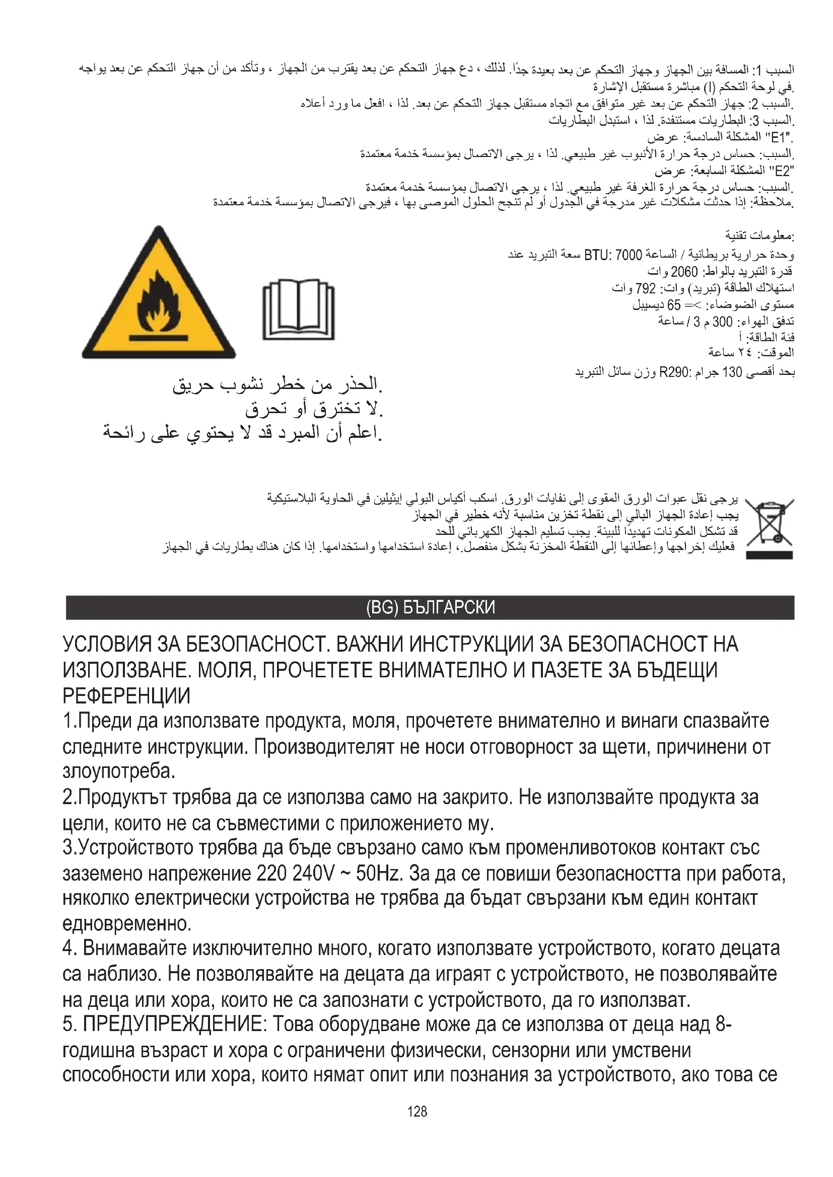 Не излагайте устройството на атмосферни условия (дъжд, слънце и др.) Не използвайте в условия на висока влажност (бани, влажни мобилни домове). прави под наблюдението на отговорно лице за тяхната безопасност или им е била предоставена информация за безопасното използване на устройството и са наясно с опасностите от използването му. Децата не трябва да играят с оборудването. Почистването и поддръжката на устройството не трябва да се извършва от деца, освен ако са на възраст над 8 години и тези дейности се извършват под наблюдение.