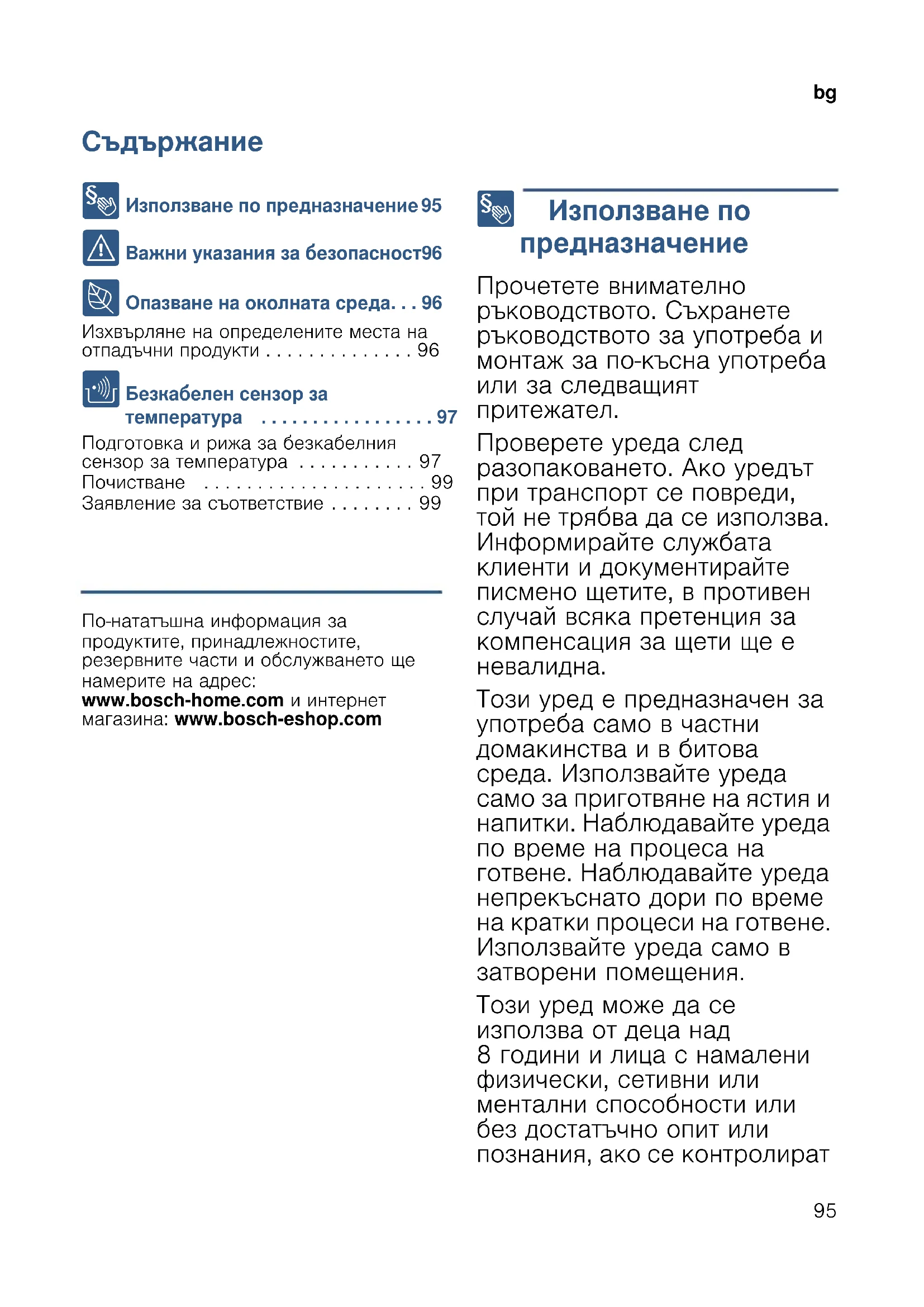 - bgРъководство 8 Използване по предназначение 95 ( Важни указания за безопасност96 7 Опазване на околната среда p. 96