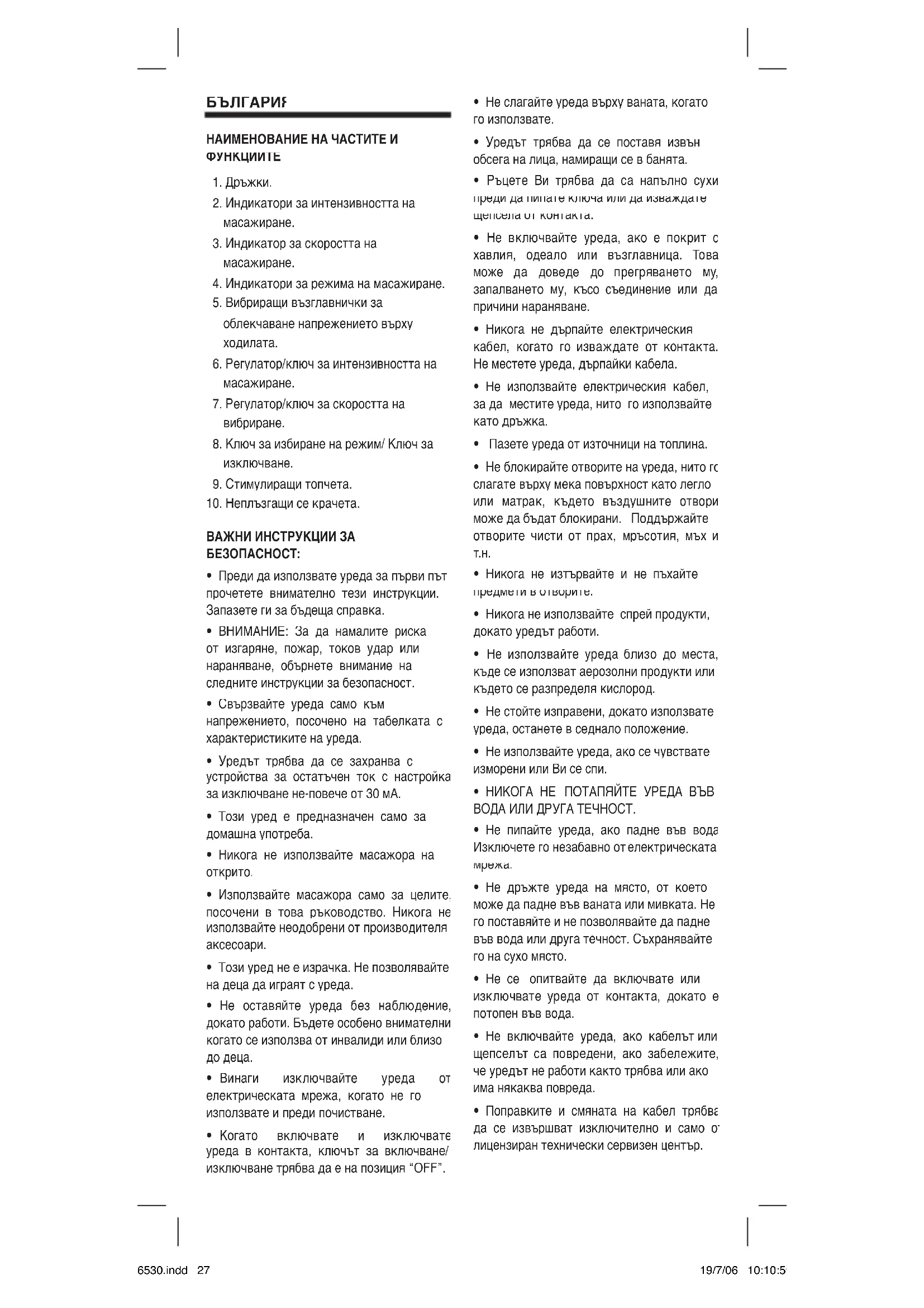 - Поправките и смяната на кабел трябва да се извършват изключително и само от лицензиран технически сервизен център. MJ6530.indd 27 19/7/06 10:10:59МЕДИЦИНСКИ ПРЕДПАЗНИ