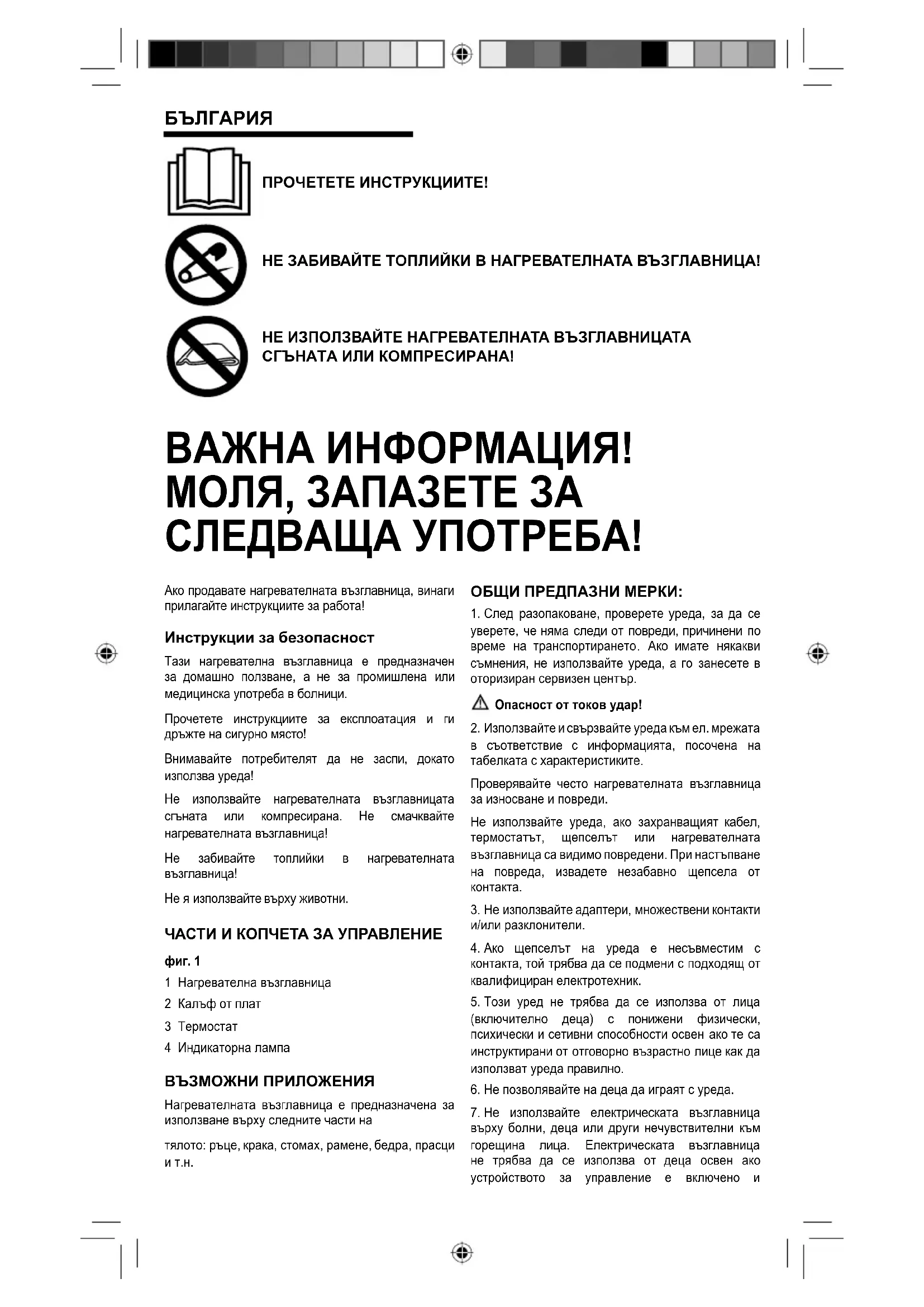 върху болни, деца или други нечувствителни към горещина лица. Електрическата възглавница не трябва да се използва от деца освен ако устройството за управление е включено инастроено от родителя или настойника или ако детето е адекватно инструктирано как да го използва безопасно.