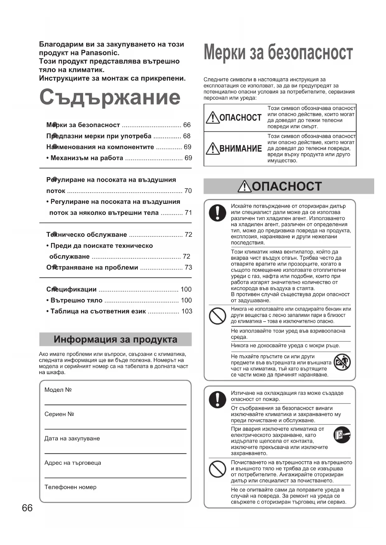 Меркизабезопасност Информациязапродукта Ако имате проблеми или въпроси, свързани с климатика, следната информация ще ви бъде полезна. Номерът на модела и серийният номер са на табелата в долната част на шкафа.Модел № Сериен № Дата на закупуванеАдрес на търговецаТелефонен номерИскайте потвърждение от оторизиран дилър или специалист дали може да се използва различен тип хладилен агент. Използването на хладилен агент, различен от определения тип, може до предизвика повреда на продукта, експлозия, нараняване и други нежелани последствия.Този климатик няма вентилатор, който да вкарва чист въздух отвън. Трябва често да отваряте вратите или прозорците, когато в същото помещение използвате отоплителни уреди с газ, нафта или подобни, които при работа изгарят значително количество от кислорода във въздуха в стаята. В противен случай съществува дори опасност от задушаване.Никога не използвайте или складирайте бензин или други вещества с лесно запалими пари в близост до климатика – това е изключително опасно.Не използвайте този уред във взривоопасна среда.Никога не докосвайте уреда с мокри ръце.Не пъхайте пръстите си или други предмети във вътрешната или външната част на климатика, тъй като въртящите се части може да причинят нараняване.Изтичане на охлаждащия газ може създаде опасност от пожар.От съображения за безопасност винаги изключвайте климатика и захранването му преди почистване и обслужване.При авария изключете климатика от електрическото захранване, като издърпате щепсела от контакта, изключите прекъсвача или изключите захранването.Почистването на вътрешността на вътрешното и външното тяло не трябва да се извършва от потребителите. Ангажирайте оторизиран дилър или специалист за почистването.Не се опитвайте сами да поправите уреда в случай на повреда. За ремонт на уреда се свържете с оторизиран търговец или сервиз.Следните символи в настоящата инструкция за експлоатация се използват, за да ви предупредят за потенциално опасни условия за потребителите, сервизния персонал или уреда: Този символ обозначава опасност или опасно действие, които могат да доведат до тежки телесни повреди или смърт. Този символ обозначава опасност или опасно действие, които могат да доведат до телесни повреди, вреди върху продукта или друго имущество.