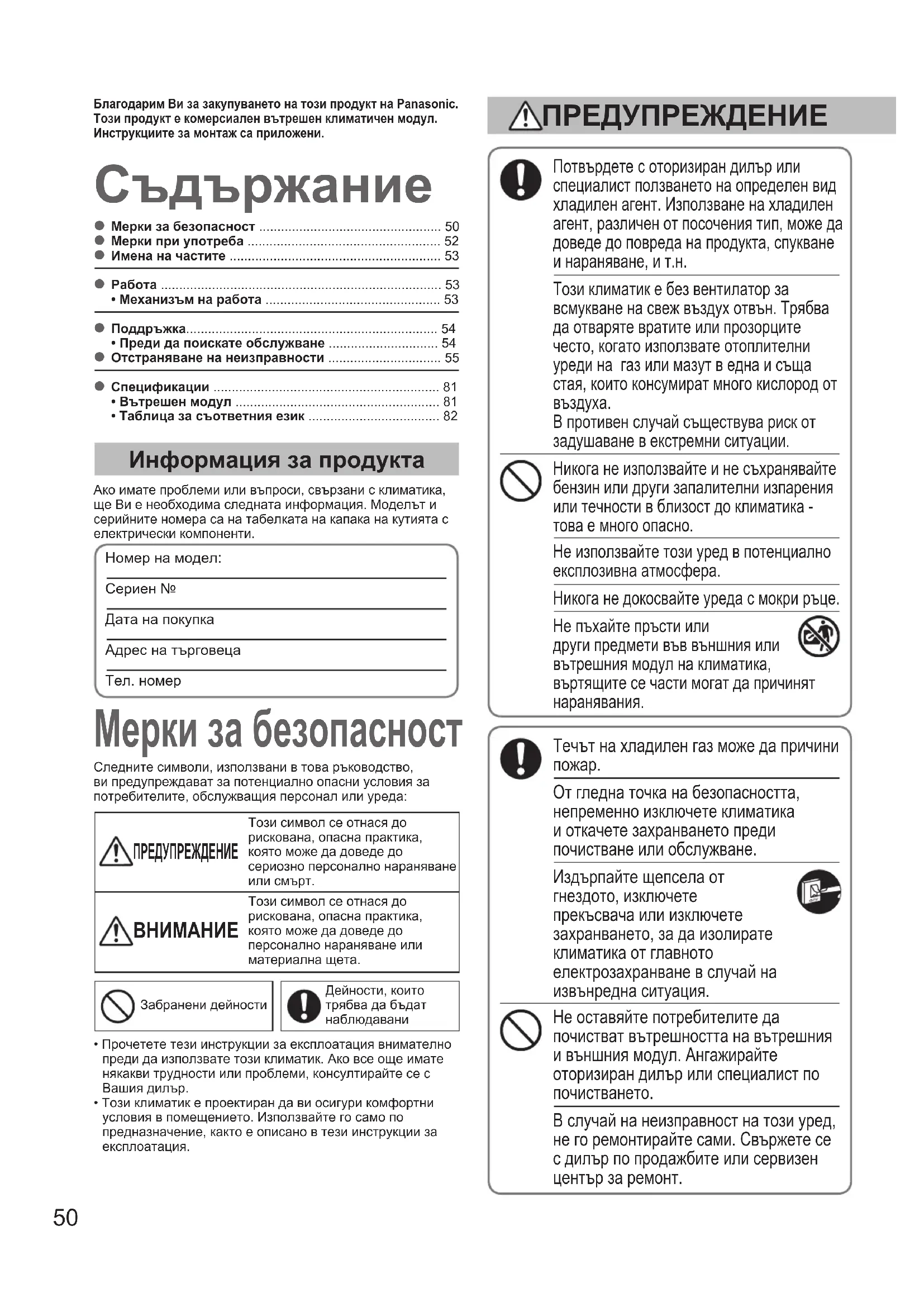 От гледна точка на безопасността, непременно изключете климатика и откачете захранването преди почистване или обслужване. Издърпайте щепсела от гнездото, изключете прекъсвача или изключете захранването, за да изолирате климатика от главното електрозахранване в случай на извънредна ситуация. Не оставяйте потребителите да почистват вътрешността на вътрешния и външния модул. Ангажирайте оторизиран дилър или спeциалист по почистването. В случай на неизправност на този уред, не го ремонтирайте сами. Свържете се с дилър по продажбите или сервизен център за ремонт. Следните символи, използвани в това ръководство, ви предупреждават за потенциално опасни условия за потребителите, обслужващия персонал или уреда: ПРЕДУПРЕЖДЕНИЕ Този символ се отнася до рискована, опасна практика, която може да доведе до сериозно персонално нараняване или смърт. Този символ се отнася до рискована, опасна практика, която може да доведе до персонално нараняване или материална щета.Забранени дейностиДейности, които трябва да бъдат наблюдаваниБлагодарим Ви за закупуването на този продукт на Panasonic.Този продукт е комерсиален вътрешен климатичен модул.Инструкциите за монтаж са приложени.• Прочетете тези инструкции за експлоатация внимателно преди да използвате този климатик. Ако все още имате някакви трудности или проблеми, консултирайте се с Вашия дилър.• Този климатик е проектиран да ви осигури комфортни условия в помещението. Използвайте го само по предназначение, както е описано в тези инструкции за експлоатация. ПРЕДУПРЕЖДЕНИЕ OI_00_F569714_EU_all.indb 50 2014-10-30 11:07:2151 Този уред е предназначен да бъде използван от експерт или обучени потребители в магазини, в леката промишленост и във ферми, или за търговска употреба от непрофесионални лица. Този уред може да се използва от деца на възраст 8 и повече години и от хора с ограничени физически, сетивни или умствени способности или липса на опит и познания, ако се наблюдават или са инструктирани относно използването на уреда по безопасен начин, и осъзнават опасностите, които това включва. Поддържайте разстояние между противопожарната аларма и въздушно изпускателното отверстие от поне 1,5 м до