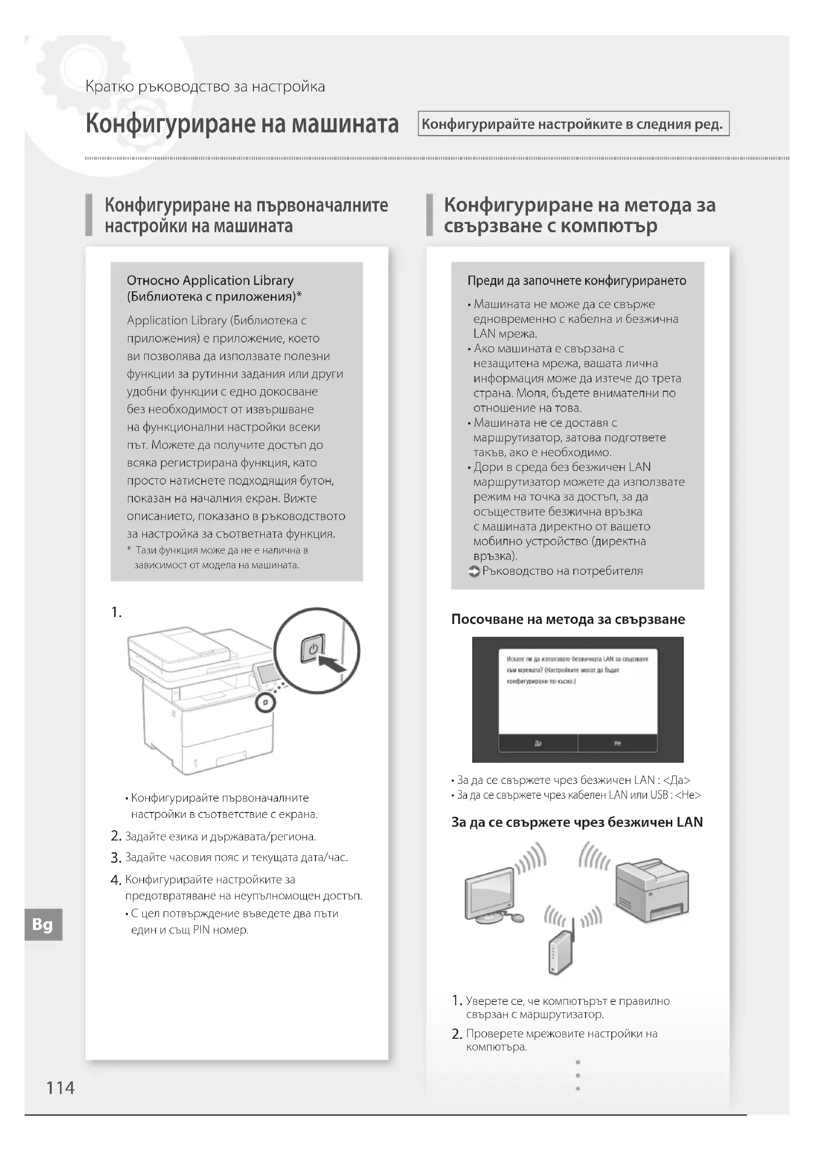 - Конфигурирайте първоначалните настройки в съответствие с екрана. Задайте езика и държавата/региона. Задайте часовия пояс и текущата дата/час. Конфигурирайте настройките за предотвратяване на неупълномощен достъп.• С цел потвърждение въведете два пъти един и същ PIN номер.Преди да започнете конфигурирането• Машината не може да се свърже едновременно с кабелна и безжична LAN мрежа.• Ако машината е свързана с незащитена мрежа, вашата лична информация може да изтече до трета страна. Моля, бъдете внимателни по отношение на това.• Машината не се доставя с маршрутизатор, затова подгответе такъв, ако е необходимо.• Дори в среда без безжичен LAN маршрутизатор можете да използвате режим на точка за достъп, за да осъществите безжична връзка с машината директно от вашето мобилно устройство (директна връзка). Ръководство на потребителяПосочване на метода за свързване• За да се свържете чрез безжичен LAN : <Да> За да се свържете чрез кабелен LAN или USB : <Не>За да се свържете чрез безжичен LAN Уверете се, че компютърът е правилно свързан с маршрутизатор. Проверете мрежовите настройки на компютъра.
