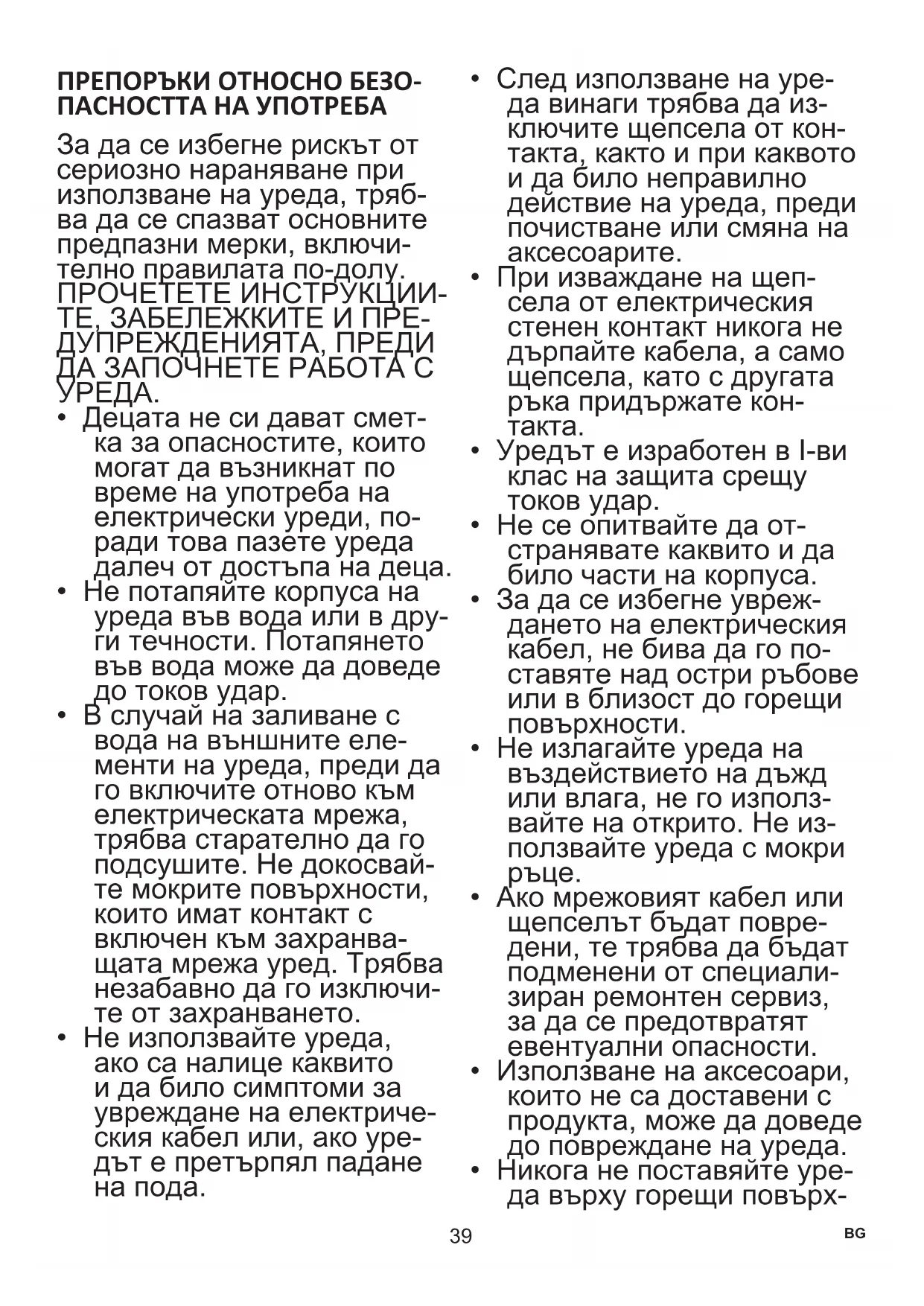 ПРЕПОРЪКИ ОТНОСНО БЕЗО- ПАСНОСТТА НА УПОТРЕБА За да се избегне рискът от сериозно нараняване при използване на уреда, тряб- ва да се спазват основните предпазни мерки, включи- телно правилата по-долу. ПРОЧЕТЕТЕ ИНСТРУКЦИИ- ТЕ, ЗАБЕЛЕЖКИТЕ И ПРЕ- ДУПРЕЖДЕНИЯТА, ПРЕДИ ДА ЗАПОЧНЕТЕ РАБОТА С