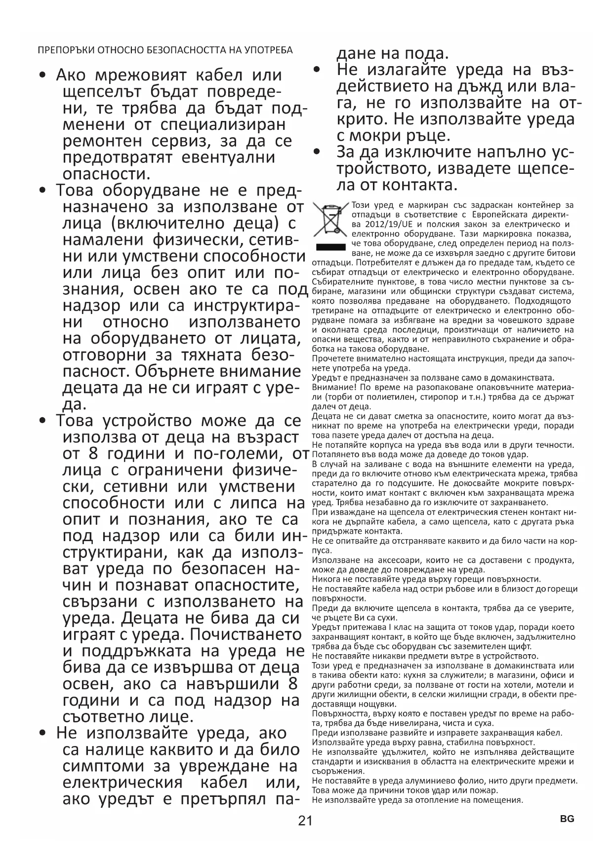 - За да изключите напълно ус- тройството, извадете щепсе- ла от контакта. Този уред е маркиран със задраскан контейнер за отпадъци в съответствие с Европейската директи- ва 2012/19/UE и полския закон за електрическо и електронно оборудване. Тази маркировка показва, че това оборудване, след определен период на полз- ване, не може да се изхвърля заедно с другите битови отпадъци. Потребителят е длъжен да го предаде там, където се събират отпадъци от електрическо и електронно оборудване. Събирателните пунктове, в това число местни пунктове за съ- биране, магазини или общински структури създават система, която позволява предаване на оборудването. Подходящото третиране на отпадъците от електрическо и електронно обо- рудване помага за избягване на вредни за човешкото здраве и околната среда последици, произтичащи от наличието на опасни вещества, както и от неправилното съхранение и обра- ботка на такова оборудване. Прочетете внимателно настоящата инструкция, преди да започ- нете употреба на уреда. Уредът е предназначен за ползване само в домакинствата. Внимание! По време на разопаковане опаковъчните материа- ли (торби от полиетилен, стиропор и т.н.) трябва да се държат далеч от деца. Децата не си дават сметка за опасностите, които могат да въз- никнат по време на употреба на електрически уреди, поради това пазете уреда далеч от достъпа на деца. Не потапяйте корпуса на уреда във вода или в други течности. Потапянето във вода може да доведе до токов удар. В случай на заливане с вода на външните елементи на уреда, преди да го включите отново към електрическата мрежа, трябва старателно да го подсушите. Не докосвайте мокрите повърх- ности, които имат контакт с включен към захранващата мрежа уред. Трябва незабавно да го изключите от захранването. При изваждане на щепсела от електрическия стенен контакт ни- кога не дърпайте кабела, а само щепсела, като с другата ръка придържате контакта. Не се опитвайте да отстранявате каквито и да било части на кор-