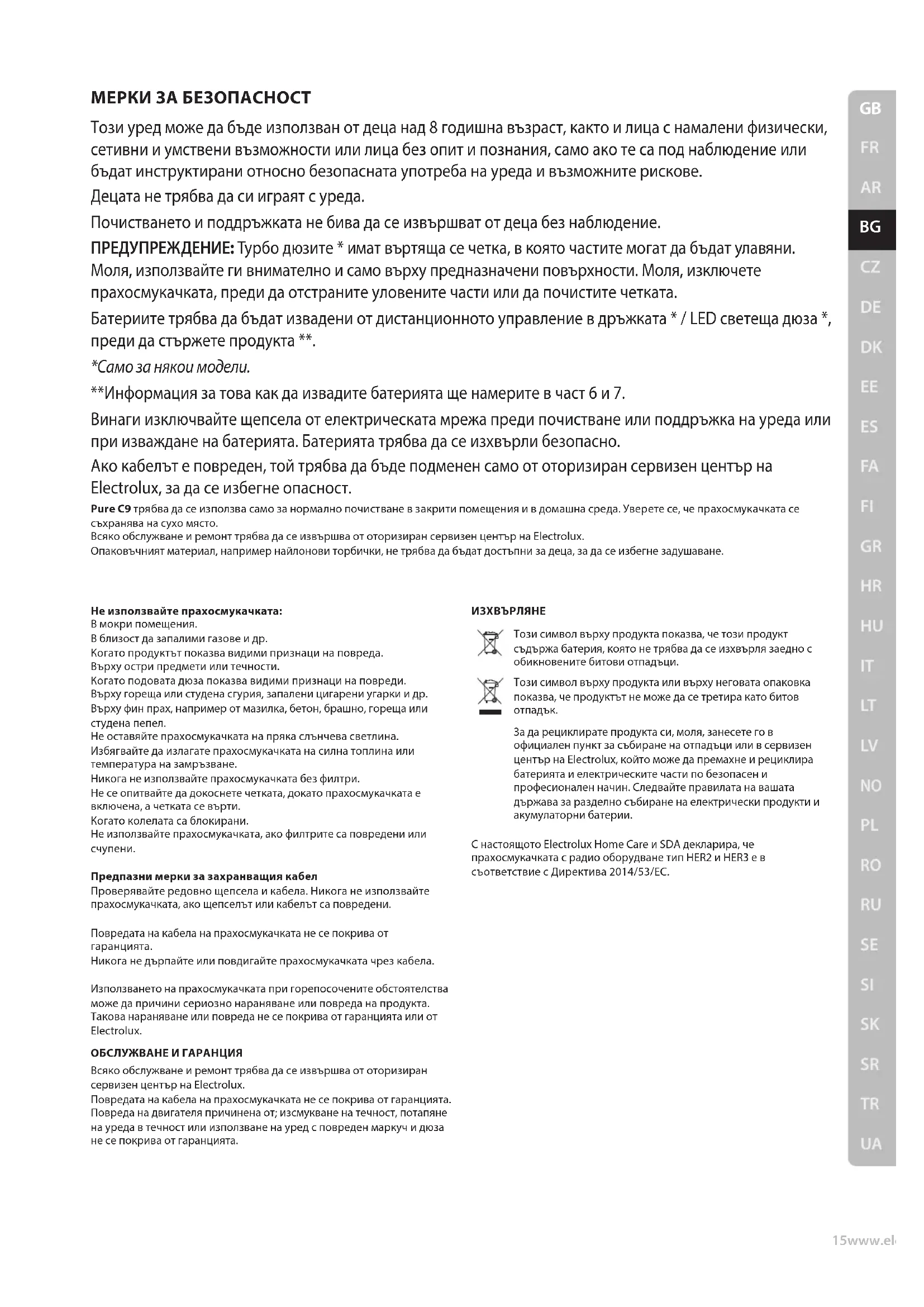 За да рециклирате продукта си, моля, занесете го в официален пункт за събиране на отпадъци или в сервизен център на Electrolux, който може да премахне и рециклира батерията и електрическите части по безопасен и професионален начин. Следвайте правилата на вашата държава за разделно събиране на електрически продукти и акумулаторни батерии. С настоящото Electrolux Home Care и SDA декларира, че прахосмукачката с радио оборудване тип HER2 и HER3 е в съответствие с Директива 2014/53/ЕС.