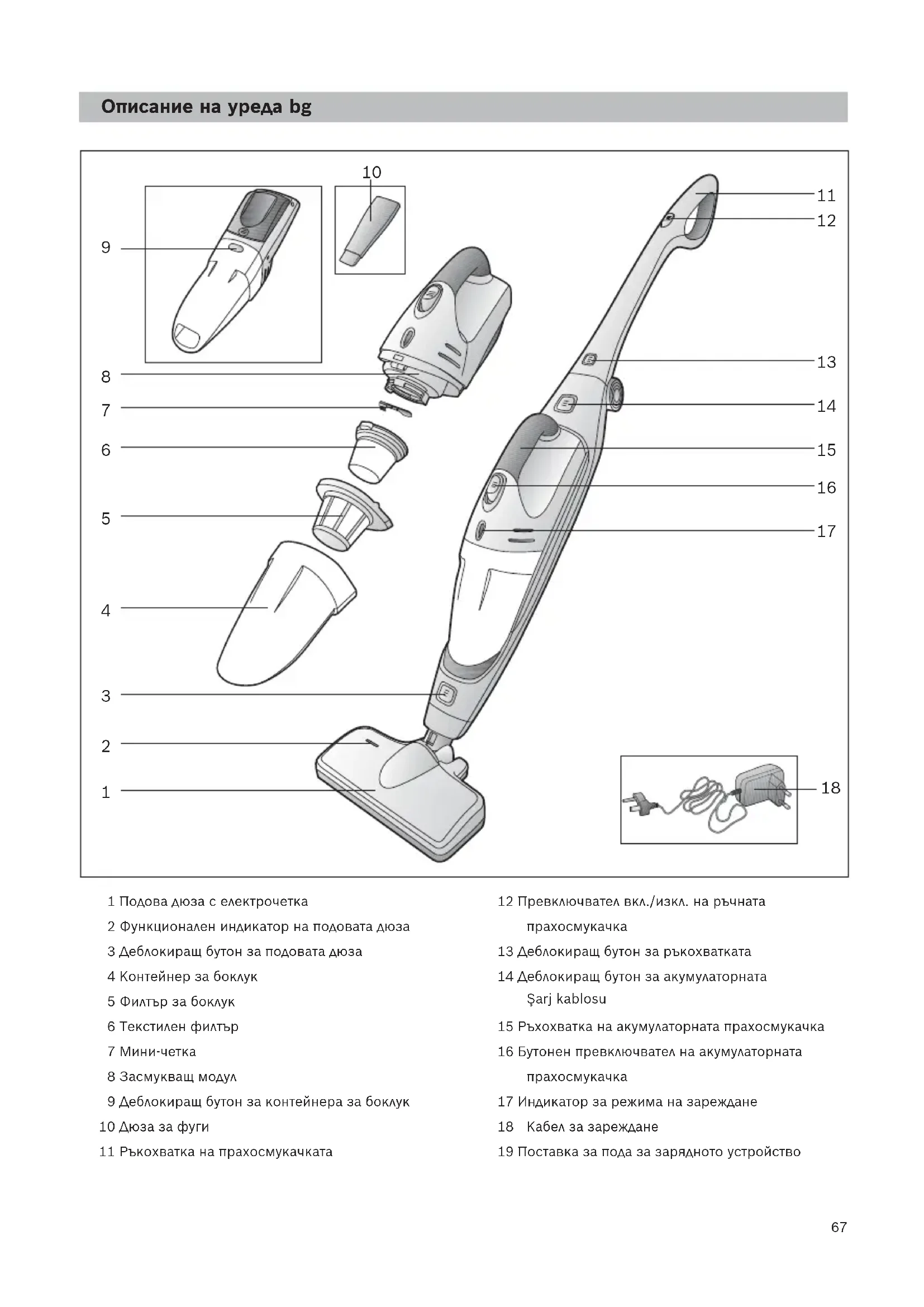 1 Подова дюза с електрочетка 2 Функционален индикатор на подовата дюза 3 Деблокиращ бутон за подовата дюза 4 Контейнер за боклук 5 Филтър за боклук 6 Текстилен филтър 7 Мини-четка 8 Засмукващ модул 9 Деблокиращ бутон за контейнера за боклук 10 Дюза за фуги 11 Ръкохватка на прахосмукачката 12 Превключвател вкл./изкл. на ръчната прахосмукачка 13 Деблокиращ бутон за ръкохватката 14 Деблокиращ бутон за акумулаторната прахосмукачка 15 Ръхохватка на акумулаторната прахосмукачка 16 Бутонен превключвател на акумулаторната прахосмукачка 17 Индикатор за режима на зареждане 18 Зарядно устройство 19 Поставка за пода за зарядното устройство 20 Кабел за зареждане Şarj kablosu Описание на уреда bg Кабел за зареждане68
