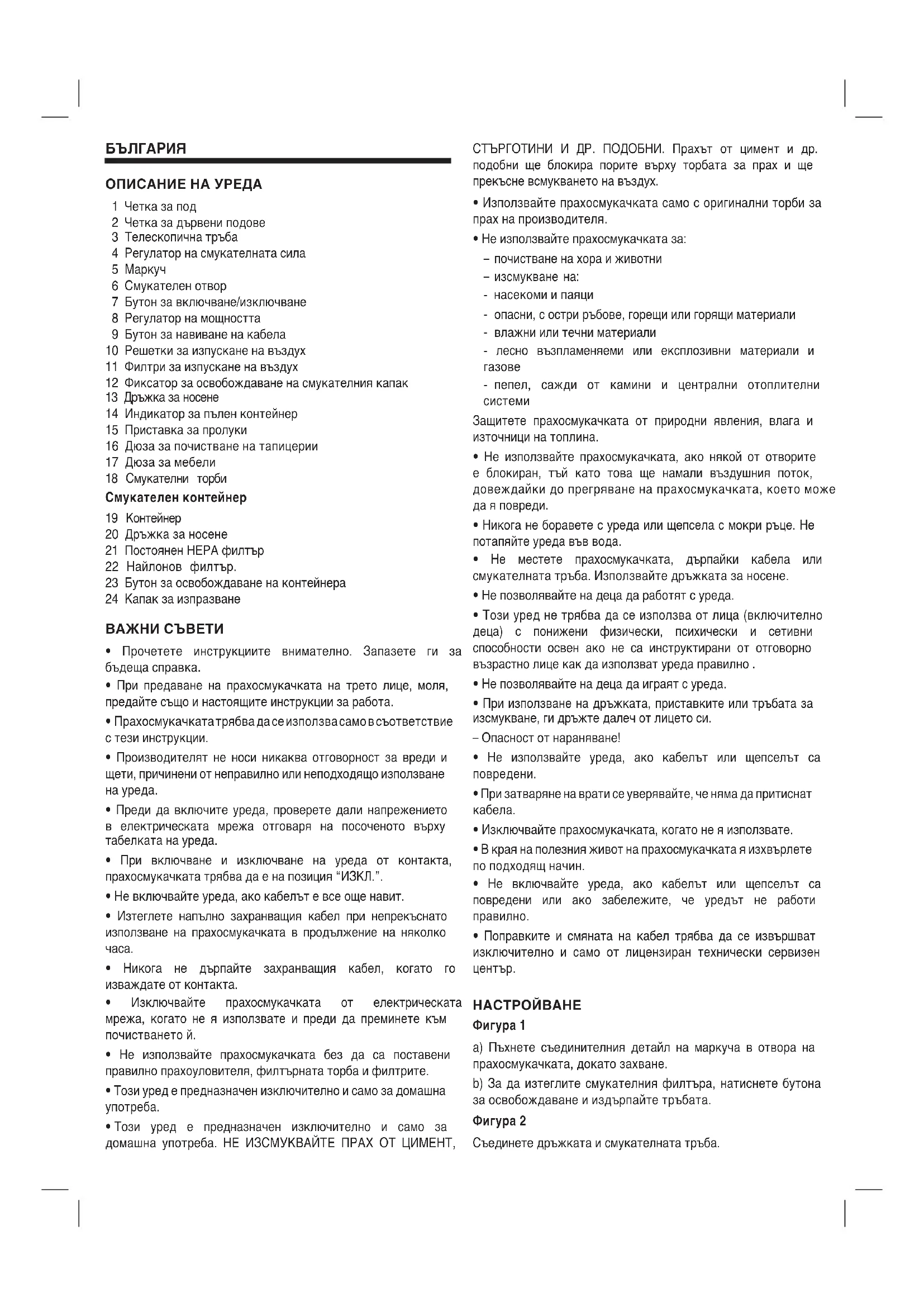 НАСТРОЙВАНЕ Фигура 1 a) Пъхнете съединителния детайл на маркуча в отвора на прахосмукачката, докато захване. b) За да изтеглите смукателния филтъра, натиснете бутона за освобождаване и издърпайте тръбата. Фигура 2 Съединете дръжката и смукателната тръба.Фигура 3 Прикрепете четката за под към телескопичната тръба. Фигура 4 Разединете телескопичната тръба и настройте дължината, движейки бутона за регулиране по посока на стрелката. Фигура 5 Държейки захранващия кабел за щепсела, издърпайте до желаната дължина, след което вкарайте щепсела в контакта. Фигура 6 Натиснете бутона за включване/изключване по посока на стрелката, за да включите/изключите прахосмукачката Фигура 7 Настройте мощността с регулатора. Фигура 8 Можете да регулирате смукателната мощност от дръжката. Отваряйки отвора, смукателната мощност намалява, и обратно, затваряйки отвора, смукателната мощност се увеличава. Фигура 9 Прикрепете приставките към смукателната тръба и дръжката според нуждите: a) Приставка за пролуки. Дълга приставка за почистване на дълбоки прорези, ъгли и т.н. b) приставка за тапицерии за почистване на тапицирани мебели, пердета и т.н. c) Приставка за тапицерии за предпазване на повърхностите от повреждане. Фигура 10 Можете да използвате приспособлението за паркиране отзад на прахосмукачката, ако желаете да спрете чистенето с нея за кратко време. Плъзнете захващащия елемент върху приставката за пода в жлеба отзад на уреда. Фигура 11 Можете да носите уреда и с помощта на двете дръжки при почистване на стъпала напр. СЛЕД ПРИКЛЮЧВАНЕ НА РАБОТА Фигура 12 Когато приключите работа с уреда, натиснете бутона за включване/изключване. Извадете щепсела от контакта и навийте кабела, като натиснете педала за автоматично навиване на кабела. Фигура 13 За съхраняване или транспортиране на прахосмукачката използвайте приспособлението за съхраняване от долната страна на прахосмукачката. Изправете прахосмукачката върху края й. Плъзнете захващащия елемент върху приставката за пода в жлеба от долната страна на уреда. Закупили сте прахосмукачка за под, която може да чисти всякакъв вид суха мръсотия, използвайки прахоуловител