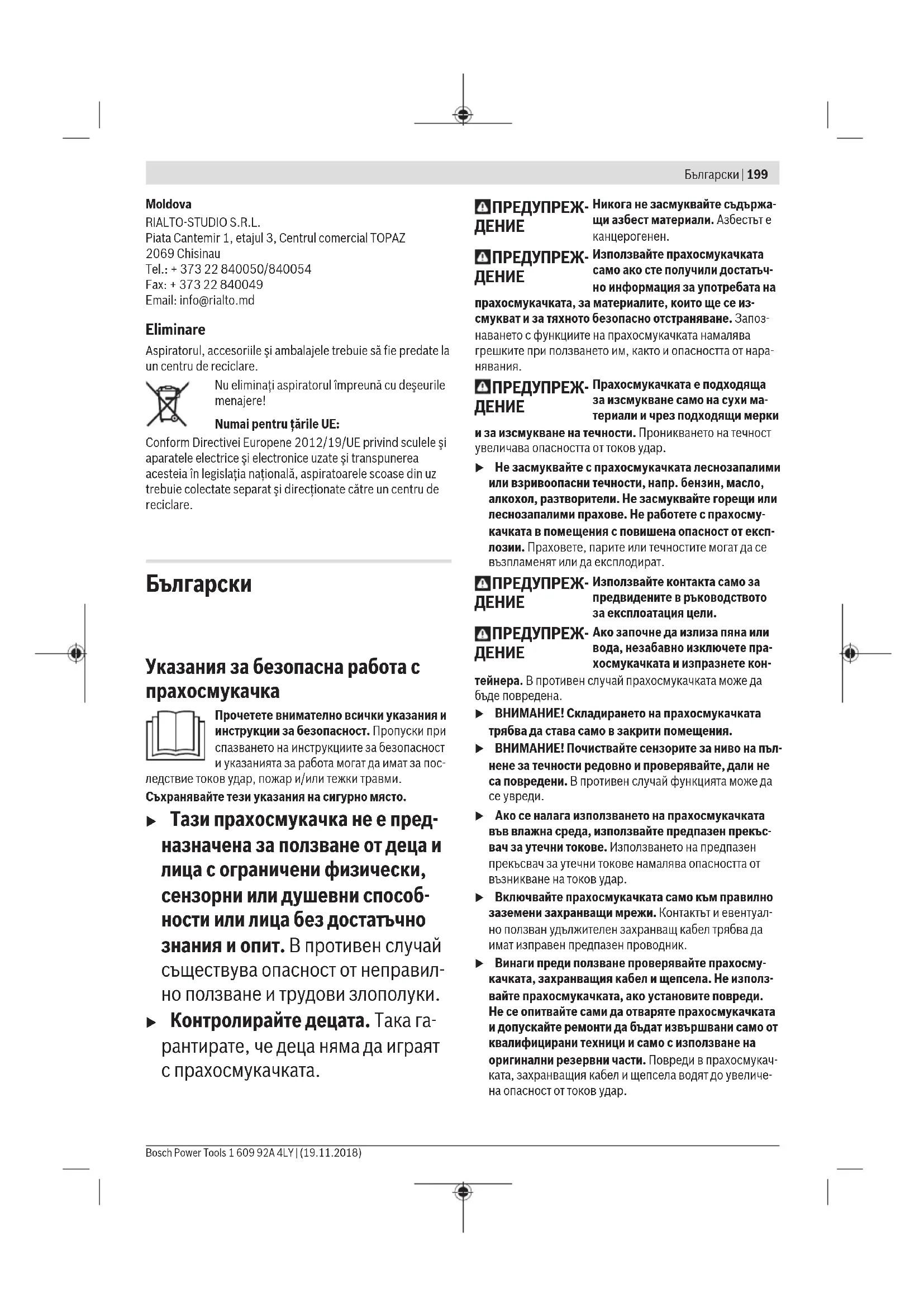 u Ако се налага използването на прахосмукачката във влажна среда, използвайте предпазен прекъс- вач за утечни токове. Използването на предпазен прекъсвач за утечни токове намалява опасността от възникване на токов удар. u Включвайте прахосмукачката само към правилно заземени захранващи мрежи. Контактът и евентуал- но ползван удължителен захранващ кабел трябва да имат изправен предпазен проводник. u Винаги преди ползване проверявайте прахосму- качката, захранващия кабел и щепсела. Не използ- вайте прахосмукачката, ако установите повреди. Не се опитвайте сами да отваряте прахосмукачката и допускайте ремонти да бъдат извършвани само от квалифицирани техници и само с използване на оригинални резервни части. Повреди в прахосмукач- ката, захранващия кабел и щепсела водят до увеличе- на опасност от токов удар. Български | 199 Bosch Power Tools 1 609 92A 4LY | (19.11.2018)200 | Български 1 609 92A 4LY | (19.11.2018) Bosch Power Tools u Не прегазвайте или не притискайте захранващия кабел. Не дърпайте кабела, за да извадите щепсела от контакта или да премествате прахосмукачката. Повредени захранващи кабели увеличават риска от то-