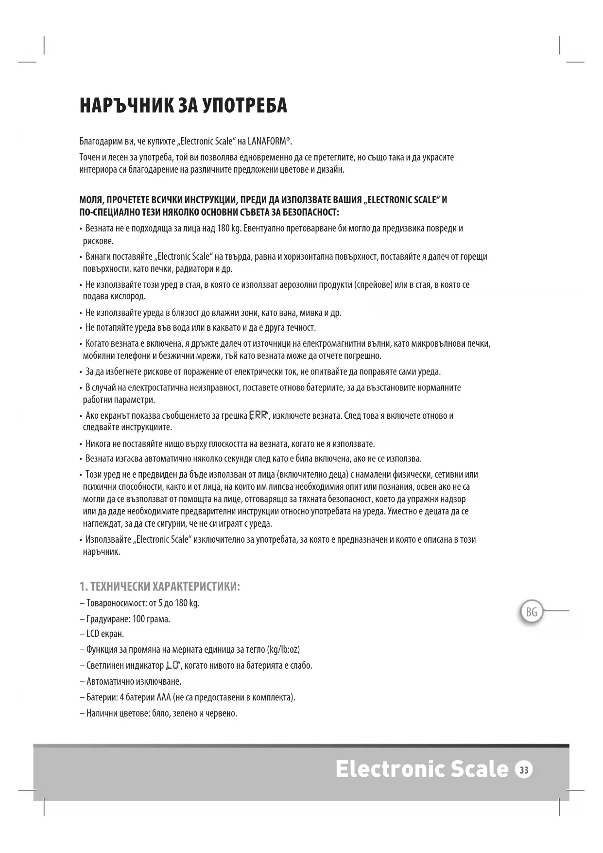 - След като престанете да използвате устройството, изхвърлете го по начин, който не вреди на околната среда и е в съответствие с изискванията на законодателството. Преди това извадете батерията и я поставете в контейнера за събиране, за да бъде рециклирана. Внимание: Използваните батерии в никакъв случай не трябва да се изхвърлят заедно с битовите отпадъци!!! ОГРАНИЧЕНА ГАРАНЦИЯ LANAFORM® гарантира, че този продукт не притежава материални и фабрични дефекти, считано от датата на закупуването му за период от две години, с изключение на уточненията по-долу. Гаранцията LANAFORM® не покрива щетите, които са причинени от нормалното износване на продукта. Гаранцията на продукта LANAFORM® не покрива също и щетите, които са причинени от неправилното или неподходящото му използване, както и от всяка друга неправилна употреба, злополука, закрепване на неразрешени аксесоари, изменение, извършено върху продукта, или при всяко друго условие, независимо от неговото естество, което не може да се контролира от LANAFORM®. LANAFORM® не носи отговорност за никаква допълнителна, последваща или специална щета. Всяка друга имплицитна гаранция за годност на продукта се ограничава за период от две години, считано от датата на първоначалното му закупуване, с изискване за представяне на копие от документа, удостоверяващ продажбата. След като получи Вашия уред, LANAFORM® ще го поправи или подмени, в зависимост от обстоятелствата, и ще Ви го върне. Гаранцията се прилага единствено посредством Сервизния център на LANAFORM®. Всяка дейност по поддръжката на този продукт, която е възложена на друго, различно от Сервизния център на LANAFORM®, лице, анулира настоящата гаранция. Фотографиите и другите представяния на продукта в това ръководство и върху опаковката показват продукта възможно най-точно, но не може да се гарантира перфектна еднаквост с продукта. Electronic Scale 35SK