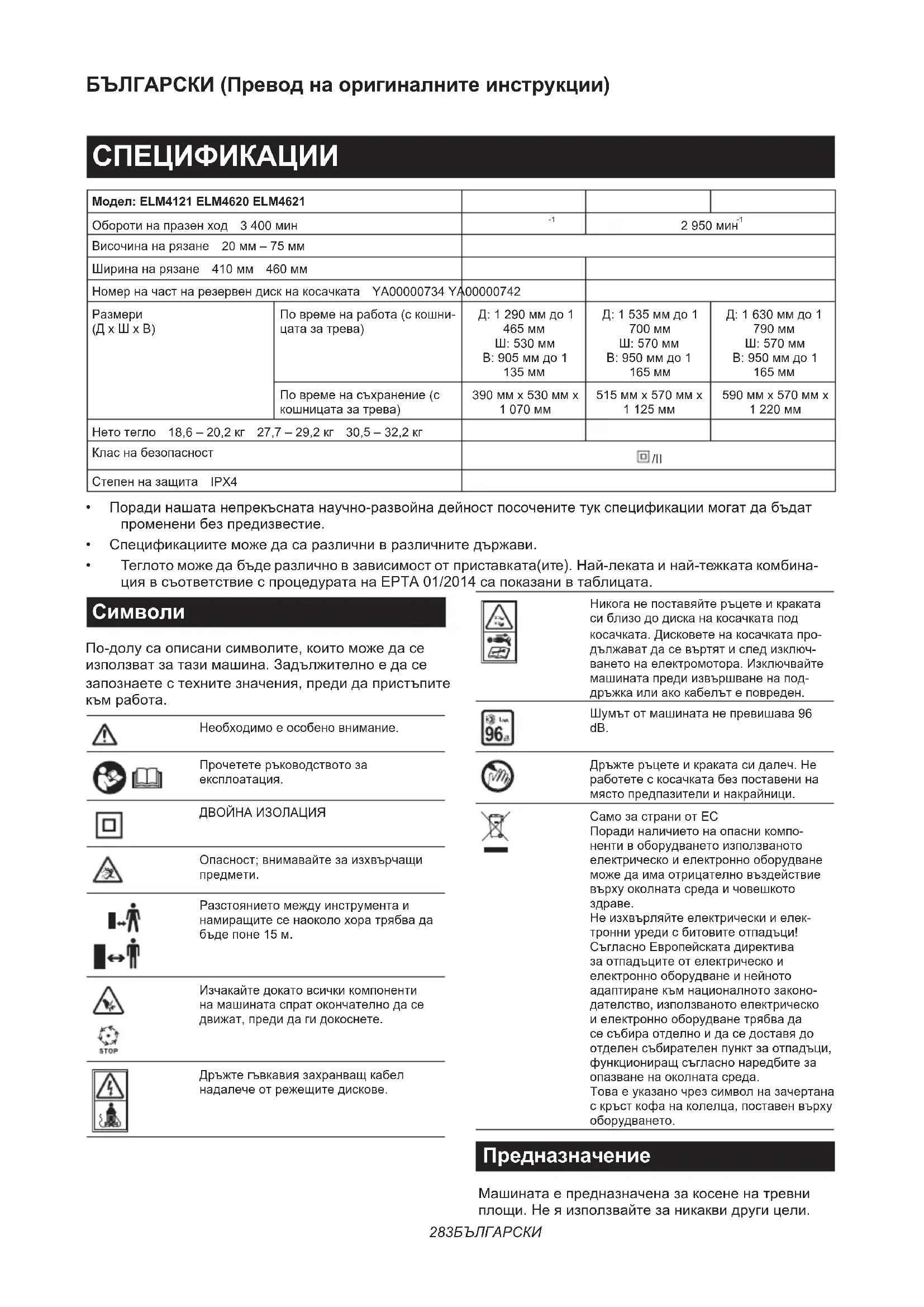 Неизхвърляйтеелектрическииелек- тронниуредисбитовитеотпадъци! СъгласноЕвропейскатадиректива заотпадъцитеотелектрическои електроннооборудванеинейното адаптиранекъмнационалнотозаконо- дателство,използванотоелектрическо иелектроннооборудванетрябвада сесъбираотделноидаседоставядо отделенсъбирателенпунктзаотпадъци, функциониращсъгласнонаредбитеза опазваненаоколнатасреда. Товаеуказаночрезсимволназачертана скръсткофанаколелца,поставенвърху оборудването. Предназначение Машинатаепредназначеназакосененатревни площи.Неяизползвайтезаникаквидругицели.284 БЪЛГАРСКИ Използванетонамашинатазадейности,коитоне сапопредназначение,можедадоведедоопасна