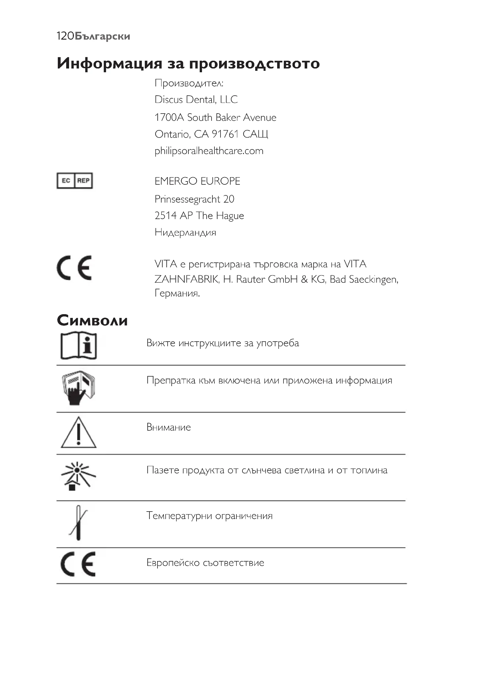 Пазете продукта от слънчева светлина и от топлина Температурни ограничения Европейско съответствие 120 БългарскиПроизводител Срок на годност Код на партида Каталожен номер Упълномощен в Европейската общност Не използвайте повторно. Този продукт е предназначен за използване при един пациент по време на единична процедура. Съхранявайте в хладилник Важна информация Прочетете и осмислете информацията в тези инструкции за употреба, както и в инструкциите за употреба, предоставени с избелващия гел за зъби с ускорено от светлината действие Philips Zoom! Whitespeed (наричан „избелващия гел“), преди да започнете процедура за избелване. Избелващият гел трябва да бъде изваден от хладилника и затоплен до стайна температура, за да се сгъсти, преди да се нанесе по зъбите на пациента. Направете едно от следните неща: - Извадете спринцовката от хладилника поне 6 часа преди употреба (за предпочитане предишната
