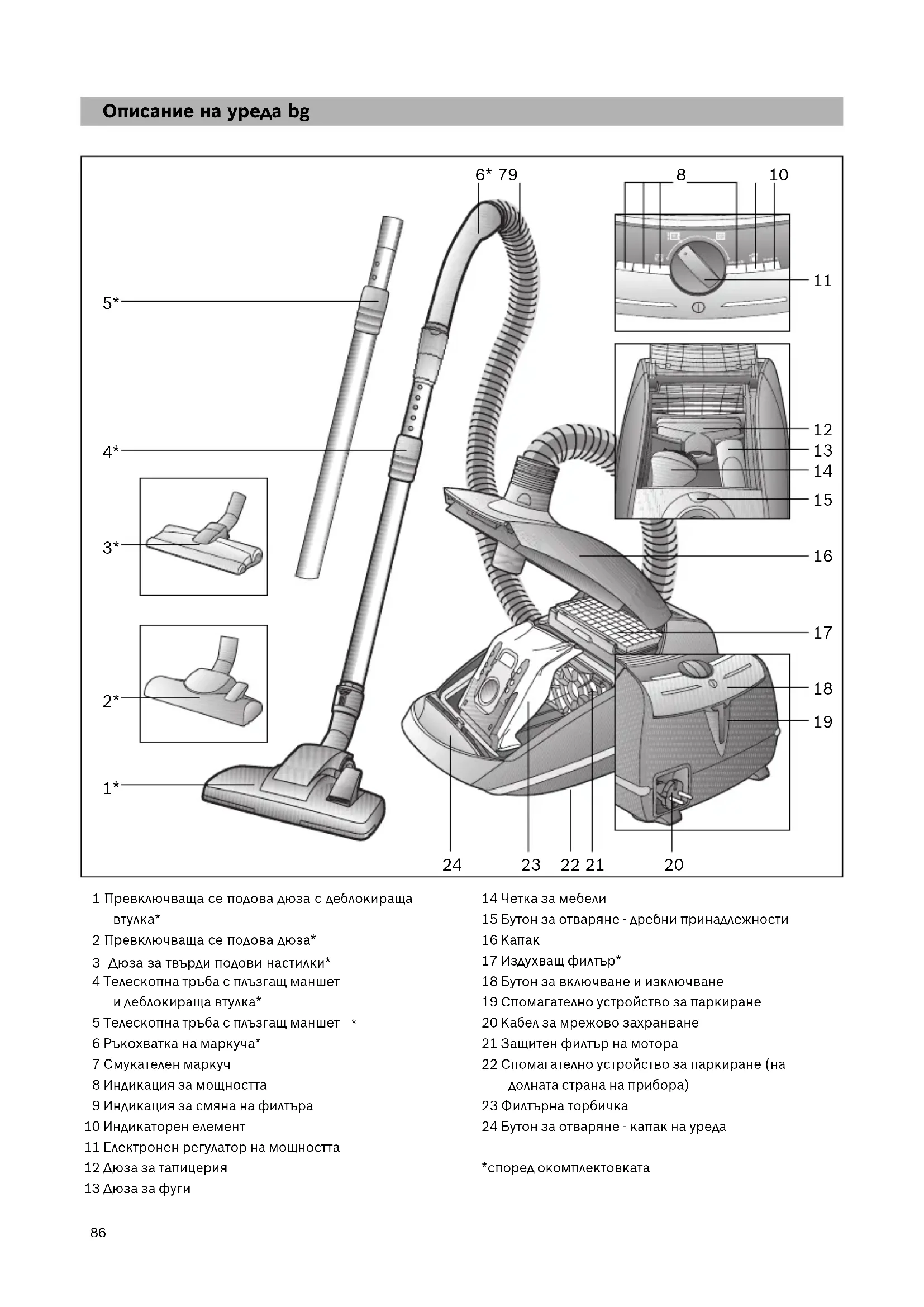 6 Ръкохватка на маркуча* 7 Смукателен маркуч 8 Индикация за мощността 9 Индикация за смяна на филтъра 10 Индикаторен елемент 11 Електронен регулатор на мощността 12 Дюза за тапицерия 13 Дюза за фуги 14 Четка за мебели 15 Бутон за отваряне - дребни принадлежности 16 Капак 17 Издухващ филтър* 18 Бутон за включване и изключване 19 Спомагателно устройство за паркиране 20 Кабел за мрежово захранване 21 Защитен филтър на мотора 22 Спомагателно устройство за паркиране (на долната страна на прибора) 23 Филтърна торбичка 24 Бутон за отваряне - капак на уреда *според окомплектовката 6* 79