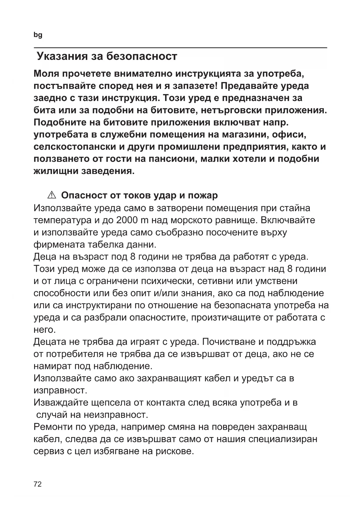 Указания за безопасност Моля прочетете внимателно инструкцията за употреба, постъпвайте според нея и я запазете! Предавайте уреда заедно с тази инструкция. Този уред е предназначен за бита или за подобни на битовите, нетърговски приложения. Подобните на битовите приложения включват напр. употребата в служебни помещения на магазини, офиси, селскостопански и други промишлени предприятия, както и ползването от гости на пансиони, малки хотели и подобни жилищни заведения. A Опасност от токов удар и пожар Използвайте уреда само в затворени помещения при стайна температура и до 2000 m над морското равнище. Включвайте и използвайте уреда само съобразно посочените върху фирмената табелка данни. Деца на възраст под 8 години не трябва да работят с уреда. Този уред може да се използва от деца на възраст над 8 години и от лица с ограничени психически, сетивни или умствени способности или без опит и/или знания, ако са под наблюдение или са инструктирани по отношение на безопасната употреба на уреда и са разбрали опасностите, произтичащите от работата с