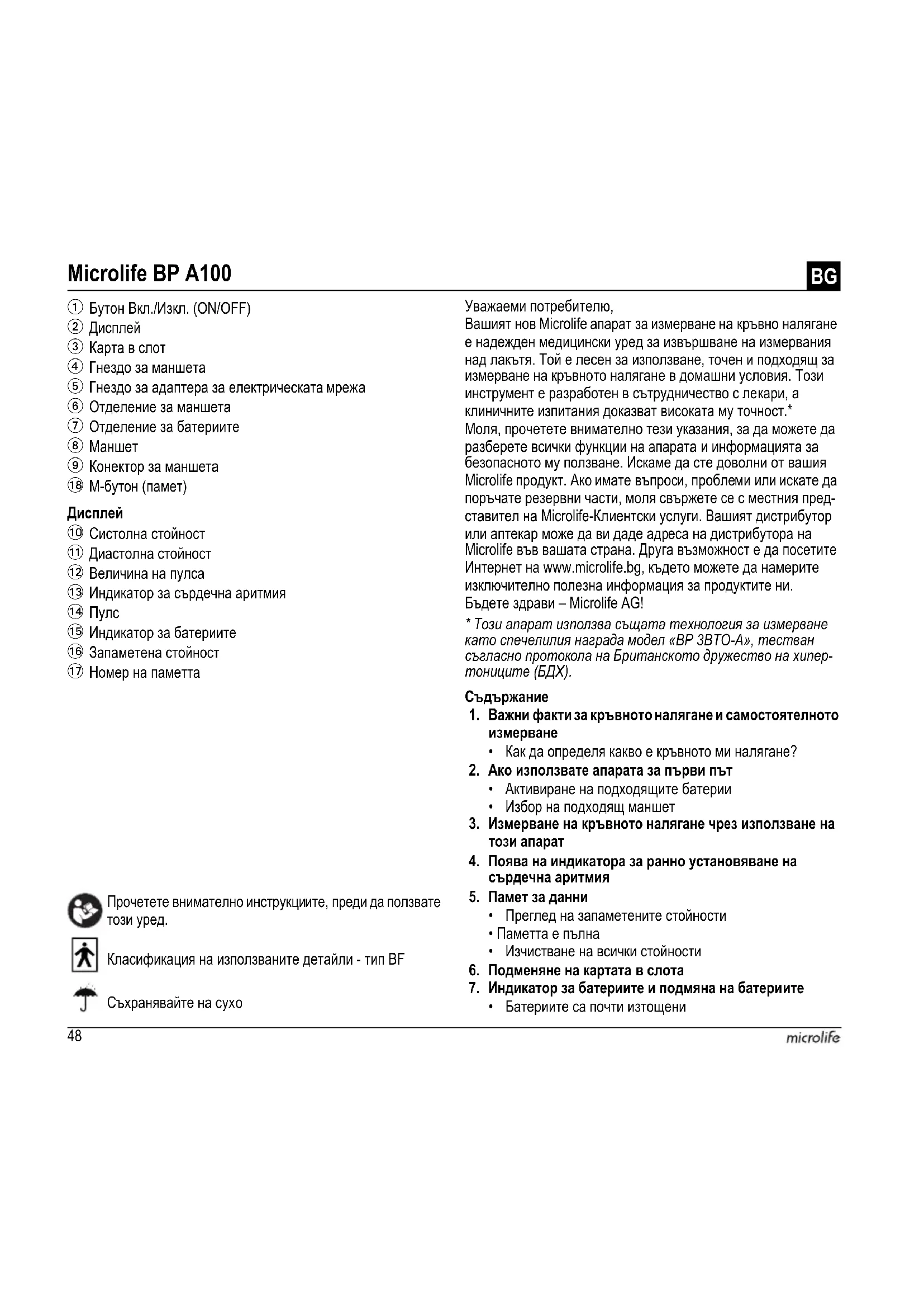 Класификация на използваните детайли - тип BF Уважаеми потребителю, Вашият нов Microlife апарат за измерване на кръвно налягане е надежден медицински уред за извършване на измервания над лакътя. Той е лесен за използване, точен и подходящ за измерване на кръвното налягане в домашни условия. Този инструмент е разработен в сътрудничество с лекари, а клиничните изпитан ия доказват високата му точност.* Моля, прочетете внимателно тези указания, за да можете да разберете всички функции на апарата и информацията за безопасното му ползване. Искаме да сте доволни от вашия Microlife продукт. Ако имате въпроси, проблеми или искате да поръчате резервни части, моля свържете се с местния пред- ставител на Microlife-Кл иентски услуги. Вашият дистрибутор или аптекар може да ви даде адреса на дистрибутора на Microlife във вашата страна. Друга възможност е да посетите Интернет на www.microlife.bg, където можете да намерите изключително полезна информация за продуктите ни. Бъдете здрави – Microlife AG!