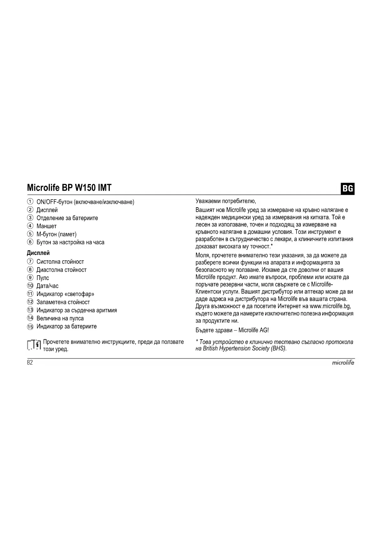 РЪКОВОДСТВО ЗА ПОТРЕБИТЕЛЯ BP W150 IMT MICROLIFE