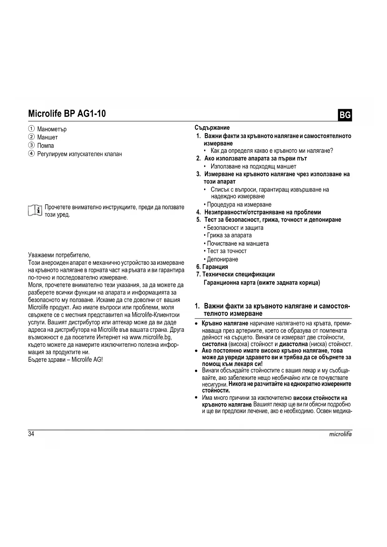 BP AG110 - Апарат за кръвно налягане MICROLIFE - Безплатно ръководство за потребителя