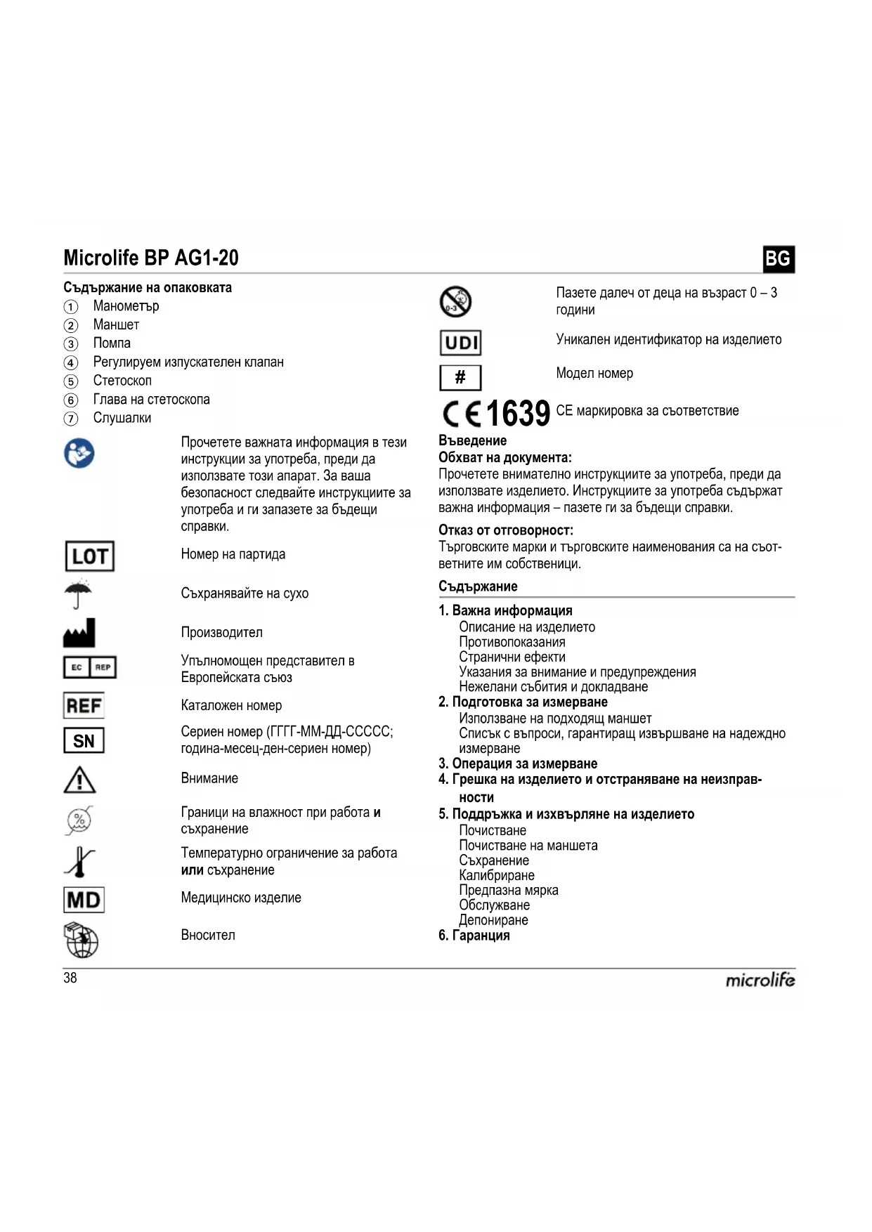 Evaluacija se radi na temelju više izmjerene vrijednosti. Primjerice: vrijednost krvnog tlaka 140/80 mmHg ili 130/90 mmHg ukazuje na «previsok krvni tlak».38 Съдържание на опаковкатаВъведениеОбхват на документа:Прочетете внимателно инструкциите за употреба, преди да използвате изделието. Инструкциите за употреба съдържат важна информация – пазете ги за бъдещи справки.Отказ от отговорност:Търговските марки и търговските наименования са на съот-ветните им собственици.Съдържание1. Важна информацияОписание на изделиетоПротивопоказанияСтранични ефектиУказания за внимание и предупрежденияНежелани събития и докладване2. Подготовка за измерванеИзползване на подходящ маншетСписък с въпроси, гарантиращ извършване на надеждно измерване3. Операция за измерване4. Грешка на изделието и отстраняване на неизправ-ности5. Поддръжка и изхвърляне на изделиетоПочистванеПочистване на маншетаСъхранениеКалибриранеПредпазна мяркаОбслужванеДепониране6. Гаранция Microlife BP AG1-20