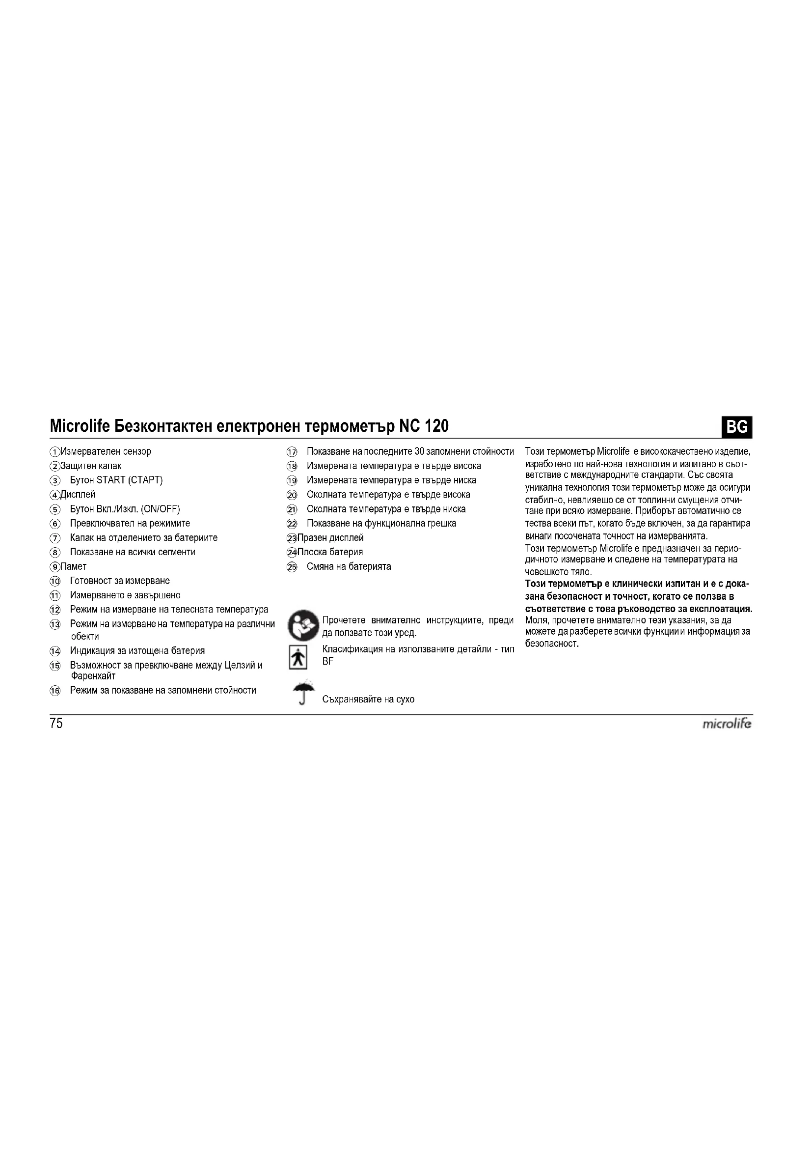 Този термометър Microlife е висококачествено изделие, изработено по най-нова технология и изпитано в съот- ветствие с международните стандарти. Със своята уникална технология този термометър може да осигури стабилно, невлияещо се от топлинни смущения отчи- тане при всяко измерване. Приборът автоматично се тества всеки път, когато бъде включен, за да гарантира винаги посочената точност на измерванията. Този термометър Microlife е предназначен за перио- дичното измерване и следене на температурата на човешкото тяло. Този термометър е клинически изпитан и е с дока- зана безопасност и точност, когато се ползва в съответствие с това ръководство за експлоатация. Моля, прочетете внимателно тези указания, за да можете да разберете всички функции и информация за безопасност. Microlife Безконтактен електронен термометър NC 120