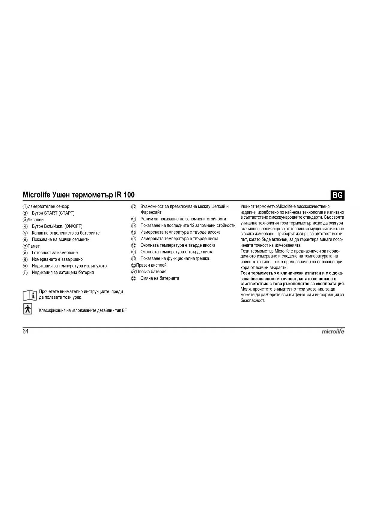 Прочетете внимателно инструкциите, преди да ползвате този уред. Класификация на използваните детайли - тип BF Ушният термометър Microlife е висококачествено изделие, изработено по най-нова технология и изпитано в съответствие с международните стандарти. Със своята уникална технология този термометър може да осигури стабилно, невлияещо се от топлинни смущения отчитане с всяко измерване. Приборът извършва автотест всеки път, когато бъде включен, за да гарантира винаги посо- чената точност на измерванията. Този термометър Microlife е предназначен за перио- дичното измерване и следене на температурата на човешкото тяло. Той е предназначен за ползване при хора от всички възрасти. Този термометър е клинически изпитан и е с дока- зана безопасност и точност, когато се ползва в съответствие с това ръководство за експлоатация. Моля, прочетете внимателно тези указания, за да можете да разберете всички функции и информация за безопасност. Microlife Ушен термометър IR 100