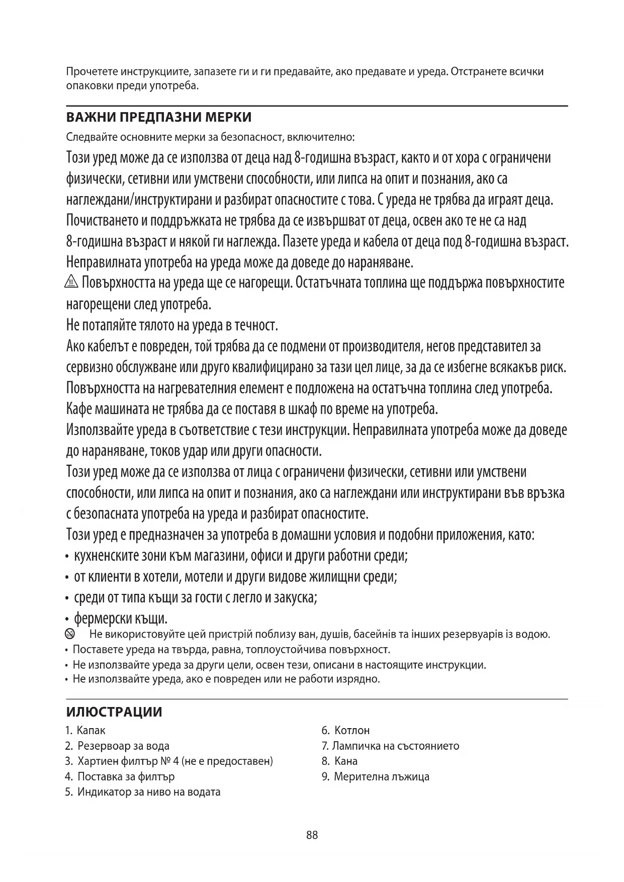 Pentru a evita problemele de mediu și de sănătate cauzate de substanțele periculoase, aparatele și bateriile reîncărcabile și cele obișnuite marcate cu unul dintre aceste simboluri, nu trebuie eliminate împreună cu deșeurile municipale nesortate. Eliminați întotdeauna produsele electrice și electronice și, după caz, bateriile reîncărcabile și cele obișnuite, la un punct de reciclare/colectare corespunzător.88 Прочетете инструкциите, запазете ги и ги предавайте, ако предавате и уреда. Отстранете всички опаковки преди употреба. ВАЖНИ ПРЕДПАЗНИ МЕРКИ Следвайте основните мерки за безопасност, включително: Този уред може да се използва от деца над 8-годишна възраст, както и от хора с ограничени физически, сетивни или умствени способности, или липса на опит и познания, ако са наглеждани/инструктирани и разбират опасностите с това. С уреда не трябва да играят деца. Почистването и поддръжката не трябва да се извършват от деца, освен ако те не са над 8-годишна възраст и някой ги наглежда. Пазете уреда и кабела от деца под 8-годишна възраст. Неправилната употреба на уреда може да доведе до нараняване. h Повърхността на уреда ще се нагорещи. Остатъчната топлина ще поддържа повърхностите нагорещени след употреба. Не потапяйте тялото на уреда в течност. Ако кабелът е повреден, той трябва да се подмени от производителя, негов представител за сервизно обслужване или друго квалифицирано за тази цел лице, за да се избегне всякакъв риск. Повърхността на нагревателния елемент е подложена на остатъчна топлина след употреба. Кафе машината не трябва да се поставя в шкаф по време на употреба. Използвайте уреда в съответствие с тези инструкции. Неправилната употреба може да доведе до нараняване, токов удар или други опасности. Този уред може да се използва от лица с ограничени физически, сетивни или умствени способности, или липса на опит и познания, ако са наглеждани или инструктирани във връзка с безопасната употреба на уреда и разбират опасностите. Този уред е предназначен за употреба в домашни условия и подобни приложения, като: