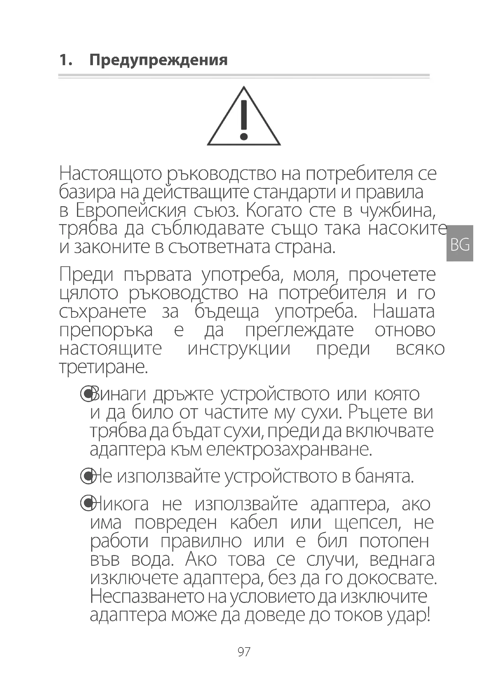 ●Винаги изключвайте устройството и изваждайте адаптера от електро- захранването, когато не използвате устройството, преди да пристъпите към почистването му или в случай на повреда.
