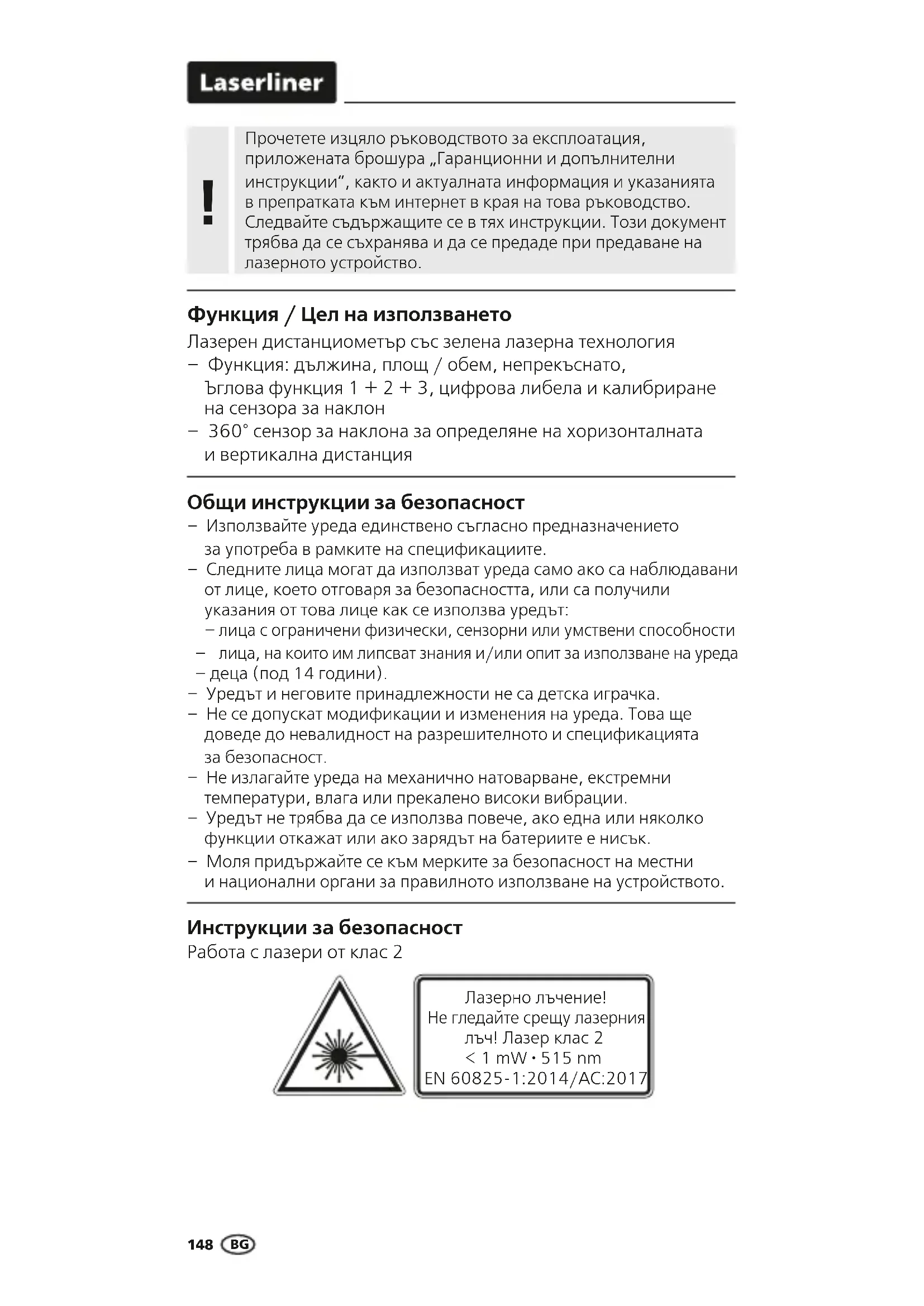 Инструкции за безопасност Работа с лазери от клас 2 Общи инструкции за безопасност – Използвайте уреда единствено съгласно предназначението за употреба в рамките на спецификациите. – Следните лица могат да използват уреда само ако са наблюдавани от лице, което отговаря за безопасността, или са получили указания от това лице как се използва уредът: