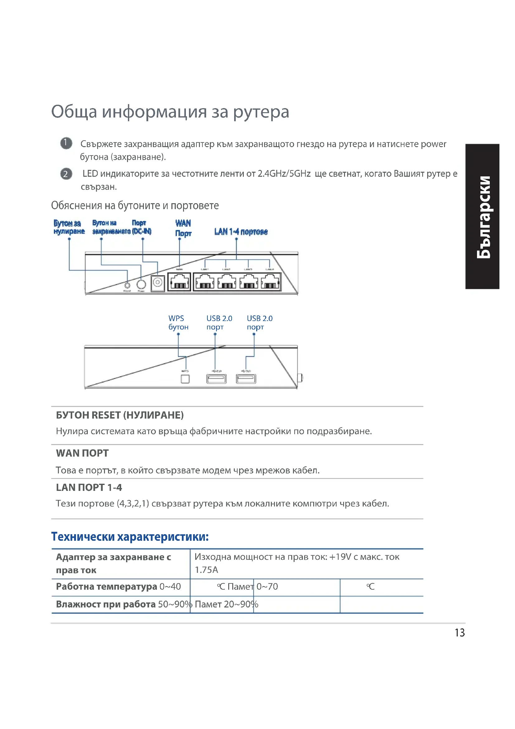 Обща информация за рутера Обяснения на бутоните и портовете БУТОН RESET (НУЛИРАНЕ) Нулира системата като връща фабричните настройки по подразбиране. WAN ПОРТ Това е портът, в който свързвате модем чрез мрежов кабел. LAN ПОРТ 1-4 Тези портове (4,3,2,1) свързват рутера към локалните компютри чрез кабел. Адаптер за захранване с